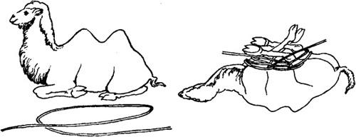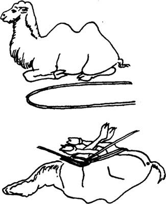 释义 | 侧卧保定 (一)绳圈侧卧保定法 一人向下牵拉鼻绳,使骆驼伏卧。另两人先在倒卧侧地面上紧贴骆驼放置一个与肩端至臀端等长的绳圈,然后在倒卧侧同时按住驼峰,先向对侧推一下,再向倒卧侧压倒骆驼的躯体,在牵驼人配合按住头部后,二人分别移至骆驼四肢的前后方,分别从四肢的前、后面拿起绳端和绳套,并把各自的绳端穿过对方的绳套,同时收紧,使四肢交叉靠拢后,打结固定(图4.1.4)。为了牢固,可在四肢管部交叉处再用另一短绳捆缚。 图4.1.4 绳圈侧卧保定法 (二)折绳侧卧保定法 一人下拉牵鼻绳,令骆驼伏卧。另两人将长绳对折,紧贴骆驼平展放置在倒卧侧地面上,对折端略超出肩端,然后同时推、按倒骆驼。骆驼侧卧后,牵驼人按住头部,二人移至骆驼腹侧四肢的前后方,前面的人从前肢前面拿起绳的对折环,后面的人从后肢后面拿起绳的两绳端,穿入绳环内,二人各拉住一绳端,分别向前、后用力拉紧,四肢并拢后打结固定(图4.1.5)。 图4.1.5 折绳侧卧保定法 (三)拉倒侧卧保定法 令骆驼伏卧,取10~12m长绳索一条,围绕卧驼四肢缠两周,绳的两游离端最后留至倒卧侧,后面的绳端上行经两驼峰间由一人向倒卧侧拉住,前面的绳端上行经颈凹由另一人拉向倒卧侧,牵驼人固定头部,另一人站立于倒卧侧的后峰处手推后峰,四人协同向倒卧侧用力,骆驼则被迫倾倒。倒卧后,继续收紧绳端,将四肢靠拢打结固定(图4.1.6)。 图4.1.6 拉倒侧卧保定法 |
