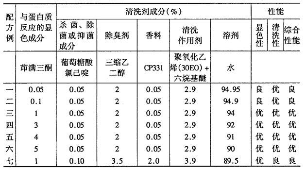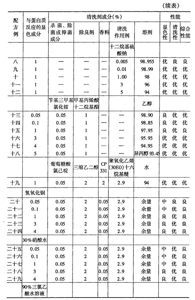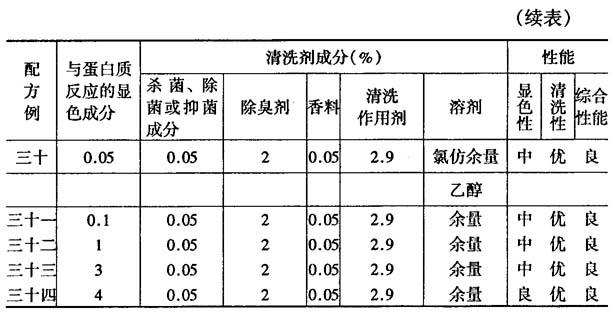 释义 | 便盆清洗剂 本清洗剂适用于清洗各种类型的大便或小便的便盆,如病人、老人或小孩用,男人或女人专用的各种便盆,家庭用的便盆或抽水马桶,公共厕所用的便盆等。本清洗剂的特点是含有与蛋白质或脂质能显色的物质,例如清洗剂中含有茚满三酮0.05%~5%(最好0.1%~3%)。茚满三酮能与蛋白质结构中的氨基酸结构显紫红色,以便显示便盆的清洗是否彻底,显示出粪便所在的位置。此外本清洗剂中还含有杀菌消毒剂,通常是季铵盐,或含氯的杀菌剂(例如苯甲基三甲基氯化铵(新洁尔灭),含量通常为0.003%~10%,最好为0.01%~5%);有除臭作用的除臭剂,如三缩乙二醇等(含量通常为0.003%~10%,最好为0.01%~5%);湖橙、湖红、钛白、酞黄、铁黑之类的染料或颜料(含量通常为30%以下)和香料(含量通常为0.001%~20%,最好为0.01%~5%)。 本清洗剂可以配制成气溶胶型,清洗剂与喷气溶剂之比为50/50~95/5。作为喷气溶剂的有C3~C4液化石油气、二氯二氟甲烷、三氯一氟甲烷、二氯四氟乙烷、二甲醚、压缩液体或压缩二氧化碳等。下表列出的是本清洗剂的各配方例及其性能。 (日本特许公开:05-85599) |