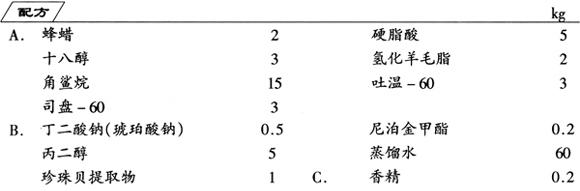 将A中各组分混合,加热至75℃,得A组分。将B中各组分混合,加热至75℃,得B组分。在搅拌下,将B组分加入A组分中,充分搅拌,混合均匀,待温度降至40℃时加入C组分,混合均匀,即为成品。