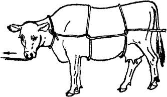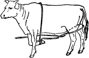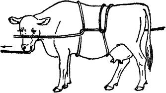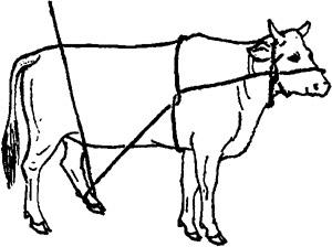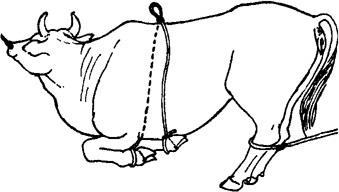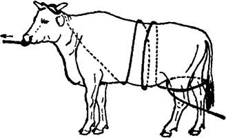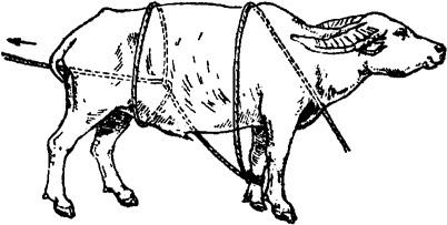 释义 | 倒卧保定 1.单抽筋倒牛保定法 取长绳一根,做成简易笼头戴在牛头上,绳游离端沿颈侧(倒卧对侧)向后,至胸侧时,将绳绕胸一周,于胸侧中央做一交扭,再引向腹下,并绕倒卧侧后肢系凹部一周,再向对侧经腹、腰背引回倒卧侧,然后术者紧拉绳的游离端,并下压腰部,可迫使牛倒卧(图3.1.9)。 图3.1.9 单抽筋倒牛保定法 2.二龙戏珠倒牛保定法 用一条长而柔软的圆绳,把绳折成一长一短,在折转处做上套结,套在倒卧侧前肢系部;将短绳从胸下经对侧向上绕过肩峰部,由倒卧侧一人拉住;长绳由倒卧侧绕腹部一周,扭一结向后由二人拉住。然后,一人牵住牛缰绳并按住牛角,将牛向前牵;当系绳套的倒卧侧的前肢抬起来时,拉短绳者立即抽紧短绳并向下压;牵牛头的人用力将牛头向倒卧对侧弯,使牛的重心向倒卧侧偏移;拉长绳的二人一并用力向后牵引,并稍向倒卧对侧拉,牛即跪下,而后卧倒(图3.1.10)。在牛卧倒时,牵牛人需注意保护牛的头部。牛倒卧后,牵牛人用力按住牛角;拉短绳的人用力抽紧短绳,并压住肩峰部;拉长绳的一人压住臀部,另一人将腰部的绳套放松并通过臀、尾部拉至跖部收紧,并与前肢绑在一起。 图3.1.10 二龙戏珠倒牛保定法 3.两道箍倒牛保定法 取6~7m长绳一根,先把绳双折,使两绳头并齐,双折头搭过腰背,由腹下再拉回,将两绳头穿过双折头向前后分开,形成两道箍。前箍放在肘后,绳头交给前方一助手;后箍放在腰肷,绳头通过背腰部拉回到倒卧侧交于另一助手,两箍之间的横行段在胸侧,与牛背平行。然后,前、后方的助手同时用力向前、后下方拉压。牵牛人妥善保定牛头,防止跳跃,牛则后躯先着地,而后向倒卧侧躺下(图3.1.11)。 图3.1.11 两道箍倒牛保定法 4.三道箍倒牛保定法 取一根长8~10m的绳子,一端以活结固定在颈部,游离端向后,绕胸围一周,于胸侧交扭,游离端再向后移于腹部,绕腰一周,于肷窝部交扭。然后,一人牵缰向前拉牛,2~3人向后拉紧后侧绳,牛即倒卧。牛倒卧后,后面拉绳的人不松拉绳,牛就不能起立(图3.1.12)。 图3.1.12 三道箍倒牛保定法 5.黄龙缠腰倒牛保定法 取一根10m长的绳子,一端固定在牛的双角根部或系成简易笼头,另一端沿颈侧向后至胸侧,由右向左,绕胸3~4圈,把最后一圈向牛体后下方滑动,套在牛后腿飞节上部,交于助手拉紧。然后,牵牛人向前拉牛鼻绳或牛鼻钳,在后方助手向后拉绳端的同时,术者一手拉牛尾,一手拍打牛臀部,驱牛前进,牛即倒卧,再用捆蹄绳把前后蹄捆在一起(图3.1.13)。 图3.1.13 黄龙缠腰倒牛保定法 6.十字倒牛保定法 取7~8m长绳一条,在1/3处双折,双折头搭在倒卧侧并垂至前肢系部。术者站在倒卧侧,将绳的双折头由牛胸下拉回,并回折双折头成圈,套在倒卧侧前肢系凹部;再将绳的长头在腹下和本绳交扭后,交助手拉向倒卧侧的前方。术者一手拉绳的短头,一手把长头在胸部形成的绳圈后移,使之滑落于两后肢的飞节上方。牵牛的人把牛头弯向倒卧对侧后方,三人同时用力,牛则卧倒。倒卧后将已靠拢的三肢固定即可(图3.1.14)。 图3.1.14 十字倒牛保定法 7.双跪式倒牛保定法 需保定者4人,4m长绳两根。由一人牵拉牛鼻环或鼻钳保定牛头。另二人分别站于牛胸侧两旁,取4m长绳一条,将绳中段搭置在牛背上;二人各执一绳头于胸腹下互换绳头后,分别拴系在前肢系凹部;再经牛背部分别提拉对侧绳段。第四人将另一长绳双折,双折头做“8”字缠绕两后肢跖部。准备好后,前、后两人同时牵、驱牛前进,两侧的两人迅速用力向下拉紧绳索,迫牛跪地,充分收紧后于背部打结固定。紧接着,牵牛人将牛头推向倒卧对侧,拉后肢的人向倒卧对侧用力拉,两侧的助手向倒卧侧推、按牛体,牛即卧倒。拉后肢的人将绳端绕两前肢系部的交叉处,用力收紧,四肢靠拢后打结固定(图3.1.15)。 图3.1.15 双跪式倒牛保定法 |