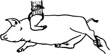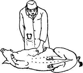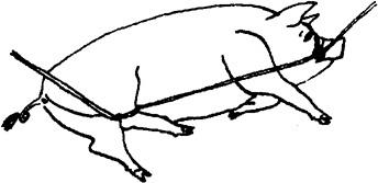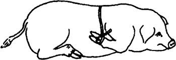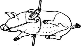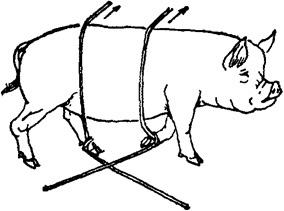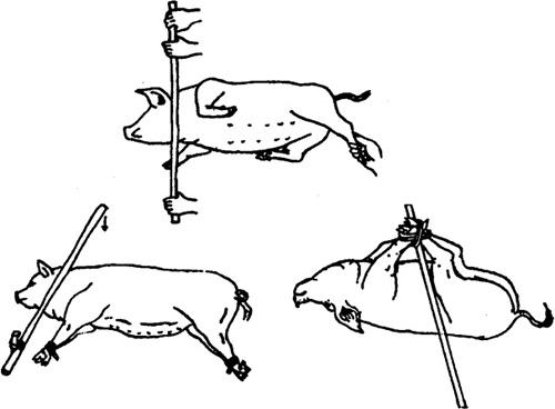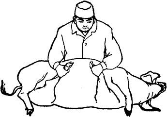 释义 | 倒卧保定 1.侧卧提单肢保定法 将猪放倒后,迅速握住猪倒卧上侧前肢的腕部,将该前肢向猪背侧扳压,同时松开后肢,使猪倒卧侧的前后蹄均离开地面,因猪的一肢被固定,另外三肢蹬空、失去挣扎能力而被牢固地保定住。此法操作简单,50kg左右的猪,只需一人即可保定(图5.1.5)。 图5.1.5 侧卧提单肢保定法 2.侧卧提双肢保定法 将猪放倒后,速以两手分别提握倒卧侧前后肢的腕部,两臂放置在上侧前后肢之间的胸腹部,两臂同时用力,两手向上提倒卧侧前后肢,两肘向下压,使猪上侧的前肢前伸,后肢后展,即被牢固的保定(图5.1.6)。 图5.1.6 侧卧提双肢保定法 3.侧卧敷单肢保定法 取长绳双折后作鼻勒保定,将猪放倒,一助手向前拉绳的一端,使鼻勒绳继续收紧;另一绳端向后,在猪倒卧上侧小腿部缠绕一周后由另一助手向后拉紧即可(图5.1.7)。 图5.1.7 侧卧敷单肢保定法 4.提肢倒卧保定法 适用于个体较大的猪。取长绳两根,分别在绳的中部结一个猪蹄结,并套在倒卧侧前肢和后肢的腕部。四绳端经腹下引向倒卧对侧,前后肢各分一绳端经胸侧拉回倒卧侧,由一人拉住;另两绳端由另一人向倒卧对侧交叉牵拉。四绳端同时拉动,将猪放倒,用下端两绳捆绑四肢即可。还可再用一木棍压在胸壁上,一端挑起捆四肢的绳,另一端由助手压住固定(图5.1.8)。 图5.1.8 提肢倒卧保定法 5.倒卧压杠保定法 将猪放倒后,在其颈部放一根木杠,两端各由一人按压,猪头部被固定,另一人拉紧后肢即可(图5.1.9)。若把木杠的一端固定在立柱或小树根部,另一端由助手按压,则更为省力(图5.1.10)。还可将四肢捆在一起,木杠的一端插入绳下,杠体压在猪的胸腰侧,助手按压在杠的另一端,猪的四蹄被挑起,呈半仰卧式被牢固保定(图5.1.11)。 图5.1.9~11 侧卧压杠保定法 6.侧卧棒绳保定法 取1m长木杠一根,一端系上绳索,放于地面上。保定者站在倒卧侧,以两手分别握住倒卧对侧的猪耳和膝皱襞,提举后将猪放倒,使猪胸侧壁压在木杠上;然后以膝抵压猪的腰臀部,拉起绳索,从猪腋下绕上来,经胸壁到背侧绕过木棒后,引绳向前;将猪嘴缠绕向后拉紧,使猪头部向后上方弯曲;再将绳端通过腋下,绕胸侧横绳,返回向前拴系在嘴与棒之间的绳上,保定者踩住地上的木棒即可(图5.1.12)。 图5.1.12 侧卧棒绳保定法 7.单柱侧卧保定法 与侧卧棒绳保定法性质相同,适用于大猪的单肢侧卧保定。将猪放倒在立柱或树干旁,使其鬐甲部紧贴立柱。取短绳一根,绕立柱并通过猪倒卧上侧腋下,抽紧绳索,使倒卧侧前后蹄离开地面,打结固定。为防止猪向上翻转,助手可向后下方按压住倒卧上侧的后肢(图5.1.13)。 图5.1.13 单柱侧卧保定法 8.伏卧保定法 取1~1.5m长的保定绳一条,绳的一端固定于猪一前肢的系部。将猪伏按于地,把绳经猪背引向对侧,缠绕另一前肢系部,同时抽紧绳子,使两前肢充分反背于胸背部,打结固定(图5.1.14)。 图5.1.14 伏卧保定法 |