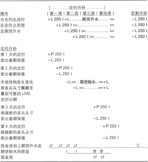 合约的内容与第8.7.2节中相同,合约订立时的期货升水被锁定以便适应提前定价的规定。后来,在前两次现货定价操作和套期保值之后,市场由期货升水变为期货贴水。对例子的评述在期货贴水时,应尽可能晚地确定价格,因此当市场远期结构从期货升水转变为期货贴水时,定价的操作应在允许范围内尽可能地向后推。同时,可以将最初锁定的头寸(+L)延期以在期货贴水中获利。当然,这样的结果是会额外产生有利或不利的现金流。