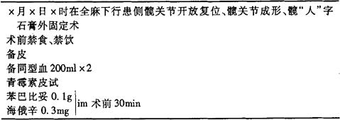 (4)3~7岁:此时闭合复位困难,应在全麻下行髋周挛缩软组织松解、切开复位,同时行Salter骨盆截骨及股骨上端旋转截骨术,术后髋“人”字石膏外固定。
