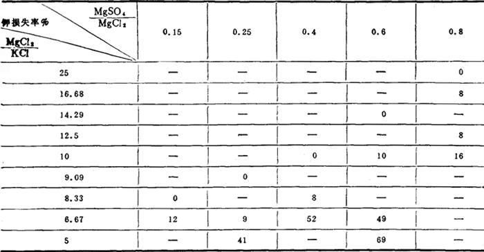 用相图理论分析,苦卤高温蒸发在光卤石饱和前没有其他钾盐结晶析出。但实际生产中,因蒸发速度很快,硫酸镁过饱度又较大,在蒸发过程中来不及充分析出,呈现介稳状态。硫酸镁的浓度比平衡状态下的浓度高出很多,使苦卤高温蒸发的析盐规律发生变化。生产实践和科学试验都证明:苦卤高温蒸发在光卤石饱和前有其他钾盐析出,并随高温盐损失掉,造成氯化钾的回收率降低。试验表明苦卤中MgCl2/KCl及MgSO4/MgCl2这两个比值对钾盐损失有很大的影响,有关试验数据见表6-2-3,由表6-2-3数据绘制成图6-2-4。