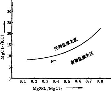 一般苦卤中MgCl2/KCl=8,MgSO4/MgCl2=0.4,标在图6-2-4、上为P点,落在有钾盐损失区。为避免这种损失,必须调整苦卤组成,提高MgCl2/KCl比值或降低MgSO4/MgCl2比值,使P点移至曲线上方。增加苦卤中氯化镁的浓度,可同时起到提高MgCl2/KCl比值及降低MgSO4/MgCl2比值的作用。由图6-2-4看出,一般苦卤当MgCl2/KCl比值提高到l0时,在高温蒸发过程中不会有钾盐损失。