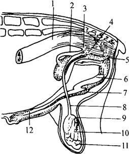 释义 | 公羊的生殖器官和生理机能 公羊的生殖器官由睾丸、附睾、阴囊、输精管、副性腺、尿生殖道和阴茎等七部分组成。公羊的生殖器官具有产生精子、分泌雄性激素以及将精液送入母羊生殖道的作用(图6-1)。 图6-1 公羊生殖器官 1.直肠 2.输精管壶腹 3.精囊腺 4.前列腺 5.尿道球腺 6.阴茎 7.S状弯曲 8.输精管 9.附睾头 10.睾丸 11.附睾尾 12.阴茎游离端 1.睾丸 睾丸为雄性生殖腺体,具有产生精子及合成和分泌雄性激素的功能。 睾丸在胚胎前期,位于腹膜外面,当胎儿发育到一定时期,它就和副睾一起通过腹股沟管进入阴囊,分居在阴囊的两个腔内。胎儿出生后公羊睾丸若未下降到阴囊,即为“隐睾”。两侧隐睾的公羊完全失去生育能力,单侧隐睾虽然有生育能力,但“隐睾”往往有遗传性,所以两侧或单侧隐睾的公羊均不能留作种用。 睾丸是一个复杂的管腺,由曲细精管、直细精管、睾丸精网、输出管及精细管间的间质等部分组成。成年公羊的睾丸呈长卵圆形,左右各一,悬垂于腹下。绵羊的睾丸重约400~500克;山羊的睾丸重约120~150克。正常的睾丸触摸时,两睾丸均应坚实,有弹性,阴囊和睾丸实质有光滑而柔软的感觉。 精子由精细管生殖上皮的生殖细胞组形成。生殖细胞在生殖上皮由表及里经过4次有丝分裂和两次减数分裂形成精子细胞,最后经过形态学变化生成精子。精子形成以后先进入曲细精管腔内,然后经直细精管和睾丸精网进入附睾中。羊的每克睾丸平均每天可产生精子(2.4~2.7)×107个。 位于精细管与曲细精管之间的间质细胞分泌雄激素。性激素能使公羊产生性欲和性行为,刺激第二性征,促进阴茎和副性腺的发育,维持精子的发生和附睾精子的存活。 2.附睾 附睾贴附于睾丸的背后缘,附睾由头、体、尾三部分组成。附睾头由许多睾丸输出管盘曲组成,借结缔组织结成若干附睾小叶,这些附睾小叶联结成扁平而略呈杯状的附睾头贴附于睾丸的头端。各附睾小叶的输出管汇成一条弯曲的附睾管,弯曲的附睾管由睾丸头端沿附着缘延伸的狭窄部分为附睾体。在睾丸的尾端扩张而成附睾尾。附睾管最后过渡为输精管。羊的附睾管长约35~50米,管径为0.1~0.3毫米。 附睾具有精子最后成熟、浓缩并供给精子营养,将成熟的精子运送和贮存于附睾尾等功能。公羊附睾贮存精子数为1500亿以上,其中68%贮存于附睾尾。 3.阴囊 阴囊是由腹壁形成的囊袋,由皮肤、内膜、睾外提肌、筋膜和总鞘膜构成,有一中隔将阴囊隔成2个腔,2个睾丸分别位于其中。阴囊具有温度调节作用,以保护精子正常生成。当外界温度下降时,借助内膜和睾外肌的收缩作用,使睾丸上举,紧贴腹壁,阴囊皮肤紧缩变厚,保持一定温度;当外界温度升高时,阴囊皮肤松弛变薄,睾丸下降,阴囊皮肤表面积增大,以利散热降温。阴囊腔的温度比正常体温低2~3℃,通常为34~36℃。 4.输精管 输精管是由附睾管延续而来,与通往睾丸的神经、血管、淋巴管、睾内提肌组成精索,一起通过腹股沟管,进入腹腔,转向后进入股盆腔通往尿生殖道,开口于尿生殖道骨盆部背侧的精阜,在接近开口处输精管逐渐变粗而形成输精管壶腹,并与精液囊的导管一同开口于尿生殖道。 输精管具有发达的平滑肌纤维,管尾厚而口径小。在交配时,由于输精管平滑肌强力的收缩作用而产生蠕动,将精子从副睾尾输送到壶腹,同时与副性腺分泌物混合,然后经阴茎射出。 5.副性腺 副性腺有精囊腺、前列腺和尿道球腺三种。射精时它们和输精管壶腹的分泌物一起混合形成精清,精清与精子共同形成精液。 精囊腺成对,位于输精管末端的外侧,呈蝶形覆盖于尿生殖道骨盆部前端。精囊腺和输精管共同开口于尿生殖道骨盆部的精阜。精囊腺分泌液含有果糖,能供给精子营养,并能刺激精子运动。 前列腺位于精囊腺的后方,为复管状腺,多个腺管开口于精阜的两侧。其分泌物呈弱碱性,能中和尿道和精液中的酸性物质,刺激并增强精子的活动能力。 6.尿生殖道 尿生殖道起自膀胱颈末端,终于龟头,可分为骨盆部和阴茎部。骨盆部为膀胱颈至坐骨弓的一段。背侧壁内粘膜上有一突出的精阜,输精管开口于精阜,另外副性腺的导管均开口于精阜的后方。阴茎部为阴茎腹侧的一段,与阴茎同长,其末端突出于阴茎,有明显的尿道突,绵羊的呈S状弯曲,山羊的较短而直。尿生殖道为尿液和精液的共同通道。 7.阴茎 阴茎是公羊的交配器官。它由阴茎海绵体和尿生殖道阴茎部分组成,其末端藏于包皮内,可分成阴茎根、体和龟头(或尖)三部分。羊的阴茎较细,体部呈“S”状弯曲在阴囊的后方,在龟头上有一丝状体,呈蜗卷状。阴茎的功能是排尿和输送精液到母羊生殖道里。阴茎平时缩于包皮内,在配种或采精时,受外界刺激,阴茎充血便勃起,由于尿生殖道的平滑肌发生收缩,精子从附睾进入输精管内与精清混合后从尿道生殖道排出。 |