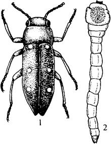 释义 | 六星吉丁虫 【学名】 Chrysobothis succedana Saunders。 【别名】 溜皮虫、串皮虫。 【分布与为害】 分布于黑龙江、吉林、辽宁、宁夏、陕西、山东、河北、江苏、湖南、甘肃、上海等地。寄主有梅花、桃、樱花、五角枫、柑橘等。幼虫蛀食枝干皮层及木质部。发生严重时,可造成整株枯死。成虫食叶。 【形态特征】 成虫体长10~13毫米,全体墨绿色,有紫黑色光泽。头部带青蓝色,头顶中央有细纵隆脊线。前胸有细横皱纹。鞘翅有纵走线,每翅上有1行直向排列的3个白色圆形凹斑。卵乳白色,椭圆形,外附绿褐色物。幼虫体长16~26毫米,体扁。头小。腹部白色,第一节特别膨大,中央有黄褐色“人”形纹,第三、四节短小,以后各节比三、四节大(图9-28)。蛹乳白色,体型、大小与成虫相似。 图9-28 六星吉丁虫 1.成虫 2.幼虫 【生活习性】 1年1代。以幼虫在木质部内越冬。4月下旬化蛹,5月中、下旬羽化,中午觅偶交尾。雌成虫多选主干分叉和树皮裂缝产卵。材质干枯的树木易被寄生。6月下旬、7月初幼虫孵化。雌虫蛀食树干韧皮部,至8月下旬进入木质部约15毫米深。成虫也咬食枝叶,补充营养。 卵期20天左右,幼虫期27天左右,蛹期30天左右。 【防治方法】 5月1日前剪除枯枝烧毁,杀其中幼虫及蛹。成虫羽化期喷50%敌敌畏1000倍液,或10%灭百可乳油1500倍液。幼虫孵化期喷40%氧化乐果,或50%杀螟松1000倍液,或40%速扑杀1500倍液,也可选用25%园科3号300倍液。 |