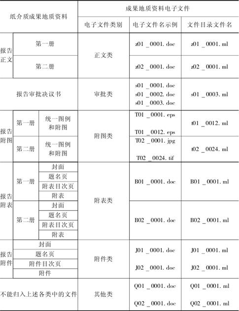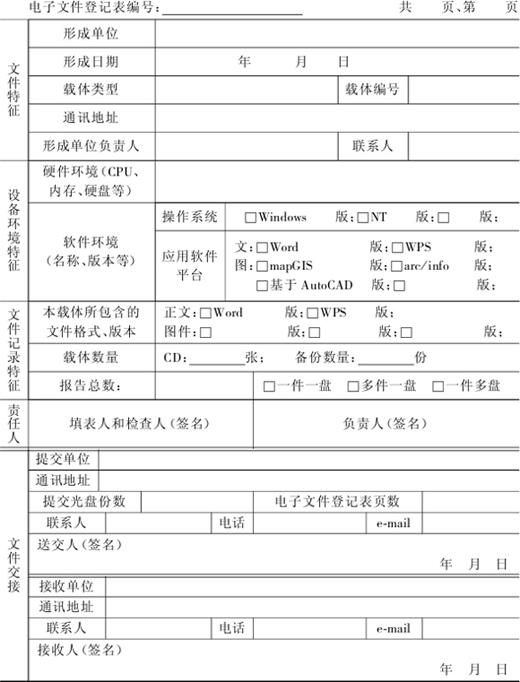 释义 | 关于开展成果地质资料电子文件汇交工作的通知 各省、自治区、直辖市、国土资源厅(国土资源环境资源厅、国土资源和房屋管理局、规划和国土资源局、房屋土地资源管理局)、中国地质调查局、有关地质资料保管单位、各地质、矿产勘查、开发及研究单位: 为推进地质资料管理现代化进程,提高地质资料管理和服务水平,充分发挥地质资料作用,国土资源部决定开展成果地质资料电子文件汇交试行工作。为鼓励汇交人积极汇交数字化地质资料,现将有关事项通知如下: 一、汇交人汇交的数字化地质资料,应符合《成果地质资料电子文件汇交格式要求》(试行,见附件)的规定,汇交的电子文件内容应与纸质成果地质资料的内容相一致。 二、已采用其他电子文件格式编制的图文地质资料,应当转化为规定的格式。不能转化的,需报经省级以上地质矿产主管部门同意,并附相应的制作系统浏览、印制软件。 三、在汇交电子文件的基础上,适当减少汇交份数和降低印制要求。凡向国务院地质矿产主管部门汇交的海洋地质、极地地质、天体地质地质资料和向省(区、市)地质矿产主管部门汇交的小型矿产地质、水文地质工程地质环境地质等地质资料,只需汇交纸质和电子文件地质资料各1份;其他成果地质资料汇交纸质和电子文件地质资料各2份,其中1份转送国务院地质矿产主管部门;可汇交激光或喷墨打印机印制的纸质地质资料,但纸质地质资料制印要清晰,着墨要牢固,应使用有利于长期保存的纸张印制。 四、开展成果地质资料电子文件汇交工作,对实现地质资料管理现代化和提高地质资料服务水平具有重要意义,各省(区、市)地质矿产主管部门及有关部门、单位要做好宣传培训工作,配备必要的硬软件设备。在实施中要不断总结经验,并将有关信息及时反馈我部储量司。 附件:《成果地质资料电子文件汇交格式要求》(试行) 二〇〇二年三月二十一日 附件 成果地质资料电子文件汇交格式要求(试行) 为保证成果地质资料电子文件能有效地管理和利用,本格式要求(试行)规定了地质资料电子文件的格式和在保存介质中的组织方式。本格式适用于成果地质资料正文(含插图、插照、插表)、附图、附表、附件等电子文件的制作和汇交。 按本格式要求制作的电子文件应与汇交的纸介质地质资料在内容上相一致。 一、成果地质资料电子文件的分类和命名 (一)成果地质资料电子文件的分类 成果地质资料电子文件按其信息内容和形式的不同,分为以下六类: 1.正文类:成果地质资料全部正文(含插图、插照和插表); 2.审批类:由法定单位对成果地质资料进行评审验收或评审认定时所形成的文件; 3.附图类:成果地质资料中除正文插图外的各种图件; 4.附表类:成果地质资料中除正文插表外的各种表格文件; 5.附件类:成果地质资料所附的技术性或说明性文字材料; 6.其他类 成果地质资料中上述五类以外的文件。 (二)成果地质资料电子文件的命名 成果地质资料电子文件按照其分类命名。文件名由8个字符组成(不包括文件名后缀),按其标识作用的不同,分为3个部分:类别位、册序位、文件序号位,如图1所示。 图1 成果地质资料电子文件名示意图1.类别位(第1位) 标识该电子文件的类别,类别代码如表1所示。 表1 成果地质资料电子文件类别代码表 2.册序位(第2—3位) 册序位用于标识该电子文件所在分册的顺序。册序位的值为01—99。若其值小于10,册序位的第1位填充“0”。同类未成册的电子文件视为一册,册序位取值“01”。 3.文件序号位(第5—8位) 标识该电子文件在本分册中的顺序。同一分册电子文件的文件序号,从“0001”起连续取值。 成果地质资料电子文件分类与纸介质报告的对应关系及文件名示例见附录A。 二、成果地质资料电子文件的文件格式及编制 (一)成果地质资料文字部分电子文件的文件格式及编制 1.电子文件的文件格式 成果地质资料文字部分电子文件的首选格式为Microsoft公司的Word97或Word2000简体中文格式,也可以采用WPS格式。其他格式的电子文件应转换或改写为上述文件格式。 成果地质资料文字部分中插图、插照的文件格式以能插入Word或WPS,且在其中能正常使用为原则,优选格式是gif、JEPG、wmf和CCITT tiff g4。 2.电子文件的编制 编制成果地质资料文字部分电子文件时,各部分的顺序和编辑格式(如字体、字号等)应该按照地质矿产行业有关标准的规定执行。 文字部分电子文件页面的尺寸以A4为宜。附表、插表横向超过A4的,按实际尺寸定。 成果地质资料电子文件应插入页码。页码位于页面底端(页脚),对齐方式为“外侧”(奇数页在右侧,偶数页在左侧)。 所有插图、插照、插表和表格等在计算机屏幕中显示的方向应向上。 (1)审批类电子文件的编制 成果地质资料中的审批类文件必须单独组成一类电子文件。 当存在多个审批验收文件时,应按照审批级次由高到低依次进行编排。对同级的认定书(决议书)、验收文件、审查意见书,以认定书(决议书)、验收文件在前,审查意见书在后进行编排;同级、同类的审批验收文件,按时间先后顺序由新到老进行编排。 审批类电子文件不得制作成栅格文件。若无原始的电子文件,应重新录入。 审批类电子文件的内容必须与正式批件一致,编排格式与正式文件尽量一致。每一份审批类电子文件必须注明发文机关(公章)、发
