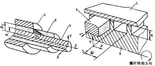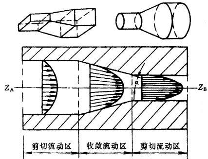 释义 | 其它流动形式 塑料材料的液体在流动的同时经常受到剪切作用和拉伸作用,即剪切流动和拉伸流动组成的复合流动。然而,这都属于无时间依赖性系统。现以两类流动形式说明如下。 1.拖曳流动 塑料液体的流变行为除受压力因素的影响外,还要受到管道中运动部件的影响。这种影响表现在粘滞性很大的塑料液体材料能随管道中的运动部件移动,这种移动称为拖曳流动。例如,挤出电缆包覆物在环隙形口模中的流动和塑料液体在挤出机螺杆螺槽与料筒壁所成的矩形通道中的流动就是典型的拖曳流动,见图1-13。 图1-13 挤出物电缆包覆物口模和挤出机螺杆中的拖曳流动 1-挤出机头 2-线缆包覆层 3-线缆芯 4-流动液体 5-挤出机料筒 6-挤出机螺杆 由图1-13可知,电线电缆包覆口模中的拖曳流动是一维流动,而塑料熔体在挤出机螺杆螺槽中的拖曳流动则是二维流动。 2.收敛流动 当塑料材料在具有恒定截面形状的管道中流动时,尽管液体中各部分随位置不同而在速度上也有不同,但在流动方向上,流线都是平行的;但当塑料熔体沿流动方向在截面尺寸变小的管道中流动时(粘弹液体在管道中流出时),熔体中各部分流线就不能再保持平行关系。例如,在层流条件下,当高分子液体从一大直径圆管流入一小直径圆管时,多数成型加工设备或模具都采用具有一定锥度的管道来实现过渡。 最常见的锥形管道是圆锥形或楔形,其截面如图1-14所示。 图1-14 圆锥形或楔形管道中的收敛流动 对于塑料熔体在这种状态下的流变行为,目前还没有定量的方程式来描述之。 |