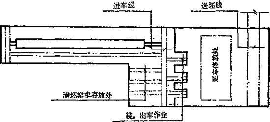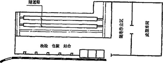 图7-26 井径日用瓷厂装、烧车间布置图 图7-25、7-26采取装车、卸车与隧道窑不在同一车间内,分隔布置的方式。这种布置方法的根据是将操作人员多的装、卸车工段与操作工人少、环境恶劣的烧成作业区分离的原则,有利于改善装、卸车工人劳动条件及保证装车区作业的工艺卫生,对于目前尚采取烧煤的隧道窑车间布置,尤应注意这些方面。 |