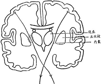 释义 | 内囊病症状群 (一)偏身运动障碍,例如出现偏瘫。 (二)偏身感觉障碍,出现于病灶对侧。 (三)偏瘫同侧出现面瘫与舌运动障碍。 (四)病灶对侧、同侧性偏盲。 (五)病灶对侧腹壁反射消失。 (六)左侧病灶可出现失语症(图81)。 图81 内囊病变 |