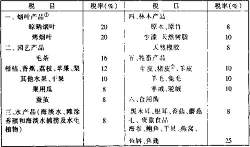 释义 | 农业特产农业税 农业特产农业税简称农业特产税,是国家对从事农业特产生产经营的单位和个人征收的一种税。它是依据现行农业税条例的有关规定开征的,目前仍是农业税的一部分。但从课税目的和税制来看,农业特产税又有其特点和相对独立性,与本意上的农业税有较大区别。 一、农业特产税的纳税人 1.在中国境内生产农业特产品的单位和个人,为农业特产农业税(以下简称农业特产税)的纳税义务人(以下简称纳税人)。这里所称“生产农业特产品的单位和个人”,是指所有从事农业特产品生产的集体经济组织、合作经济组织、企业(包括外商投资企业、外国企业)、行政事业单位、部队、学校、团体、寺庙等;经营承包户、其他个人。不含生产烟叶、牲畜产品的单位和个人。生产烟叶、牲畜产品的单位和个人仍依法缴纳农业税或牧业税。 此外,财政部规定,收购烟叶、毛茶、银耳、黑木耳、贵重食品、水产品、原木、原竹、生漆、天然树脂(不含天然橡胶)、牲畜产品的单位和个人,按照收购金额和规定的税率缴纳农业特产税。 2.收购农业特产品的单位和个人,即收购烟叶、毛茶、银耳、黑木耳、贵重食品、水产品、原木、原竹、生漆、天然树脂(不含天然橡胶)、牲畜产品的单位和个人,应当按照收购金额和规定的税率,根据税收法规的规定缴纳或者代扣代缴税款。对收购前面列举以外的其他应税产品的单位和个人,省、自治区、直辖市人民政府可以确定其为农业特产税的扣缴义务人。扣缴义务人从收购所支付的金额中代扣、代缴农业特产税。 对单位和个人收购的猪皮,从1999年1月1日起,暂停征收农业特产税。 二、农业特产税的征税对象 (一)对下列农业特产品收入,即初级产品,包括为保鲜、防腐进行初级加工、简单加工的产品收入,征收农业特产税: 1.烟叶收入,包括晾晒烟、烤烟收入。 2.园艺收入,包括水果、干果、毛茶(包括红毛茶、绿毛茶、乌龙毛茶等毛茶和边销茶原料,精制茶不在其列)、蚕茧(包括桑蚕茧、柞蚕茧)、药材、果用瓜(果用瓜包括西瓜、香甜瓜)、花卉、经济林苗木(经济林是以生产果品、食用油料、饮料、调料、工业原料、药材为主要目的的林木。经济林苗木就是为上述经济林提供的苗木)等园艺收入。 3.水产收入,包括鱼、虾、蟹、贝、海蜇、龟、鳖、乌贼、墨鱼、鱿鱼等;芦苇、席草、蒲草、莲藕、荸荠、海带、紫菜、石花菜等水生植物、滩涂养殖、海淡水养殖及捕捞品收入。 4.林木收入,包括原木、原竹、生漆、天然橡胶、天然树脂、木本油料等林木收入。 5.牲畜收入,包括牛猪羊皮、羊毛、兔毛、羊绒、驼绒等牧畜收入。 6.食用菌收入,包括黑木耳、银耳、香菇、蘑菇等食用菌收入。 7.省、自治区、直辖市人民政府确定的其他农业特产品收入。 (二)农业特产税与农业税、牧业税的划分 1.在农业税计税土地上生产农业特产品的,农业税照征,计算缴纳农业特产税时,将农业税扣除。 2.征收牧业税的地区,对生产牲畜产品的单位和个人照征收业税,不再征收农业特产税;对收购应税牲畜产品的单位和个入征收农业特产税。 (三)对进口的农业特产品不征收农业特产税。 三、农业特产税的税率 农业特产税的税率有四种:全国统一税率、地方自定税率、适用税率和地方附加,其具体内容分述如下: (一)全国统一税率。全国统一的农业特产税税目、税率,依照下列农业特产税税目税率表执行。 对征收原木、原竹农业特产税的问题的具体规定为:对生产原木、原竹的林农、农村集体经济组织等非林业系统的单位、个人,按8%的税率计算征税。对收购上述生产者生产的原木、原竹的单位和个人,按8%的税率计算征税;对不是收购上述生产者生产原木、原竹的,不征收农业特产税。对生产、销售原木、原竹的森工企业、国家林场,征收生产环节的8%和收购环节的8%农业特产税。具体计税收入,由省、自治区、直辖市征收机关根据国务院和财政部的有关规定,参照历史情况核定。 表9-1 农业特产税税目税率表 往:①自1999年起,烟叶农业特产税税率由31%降为20%,对于在烟叶收购环节由收购单位支付的从购货方取得的一切收入(含价外收入和其他各种补贴性收入),无论在财务上如何处理,均应计入烟叶收购金额,征收农业特产税。 ②从1999年1月1日起,对单位和个人收购的牛皮、羊皮,暂按5%的税率征收农业特产税。 (二)地方自定税率。在全国统一税率以外的农业特产税税率,由省、自治区、直辖市人民政府在5%-20%的幅度内规定。 (三)适用税率。此处所称的适用税率,是指适用不同纳税人和税款缴纳人的税率。之所以有如此的特别规定,是因为在1994年的税制改革中,将原征收产品税和工商统一税的农林牧水产品并人农业特产税征收。为保持税收政策的连续性,凡涉及到原征收产品税和工商统一税的农林牧水产品,在生产环节和收购环节,按适用税率由生产者和收购者分别缴纳税款。具体规定为:生产毛茶的单位和个人适用税率为7%,收购毛茶的单位和个人适用税率为12%;养殖和捕捞水产品的单位和个人适用税率为8%,收购水产品的单位和个人适用税率为5%;生产贵重食品的单位和个人适用税率为8%,收购贵重食品的单位和个人适用税率为25%;生产和收购原木、原竹的单位和个人均按《规定》的同一税率8%执行;生产和收购生漆、天然树脂(不含天然橡
