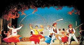 释义 | 农乐舞(乐lè) 朝鲜族民间舞蹈形式之一。 流行于吉林朝鲜族地区。形式较自由,舞者人数不限,有的持小手鼓而舞,有的男舞者头戴“象帽”,帽顶上系一“象尾”(细长的纸条),舞时用力甩动头部,使“象尾”绕身体旋转。 舞蹈风格健壮、活跃,节奏由慢转快,形成高潮。伴奏乐器有小锣、大锣、法鼓、长鼓、喇叭、胡笛等。 也有边唱边舞的歌舞形式。 农乐舞 |