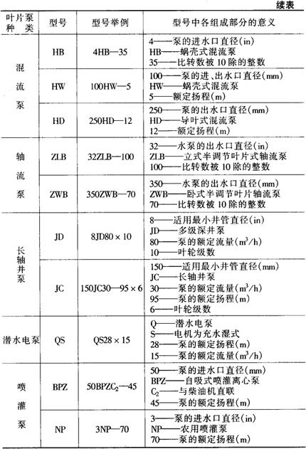 释义 | 农用水泵及其类型 (一)农用水泵的含义 主要用于农业生产、农田排灌和农民生活的水泵称为农用水泵。 不同的水泵,压水原理是不同的,常用农用水泵的压水原理可分为离心式压水、轴流式压水和混流式压水3种。 (二)农用水泵的分类 由于用途不同,要求各异,农用水泵有多种多样的形式,可按照不同的分类标准进行分类。 1.按工作原理不同分类 农用水泵按工作原理可分为叶片泵,如离心泵、轴流泵、混流泵等;容积泵,如柱塞泵、隔膜泵、齿轮泵等;其他类型的泵,如射流泵、水锤泵等。 常见的农用水泵主要是叶片泵,可概括为离心泵、轴流泵和混流泵三大类。叶片泵的共同特点是都有一个或数个叶轮,叶轮上装有数量不等的叶片。 2.按构造及使用要求分类 离心泵、轴流泵和混流泵,实际上是根据液体从叶轮流出的方向进行分类的。离心泵是液体受离心力的作用,沿径向流出叶轮的一种叶片泵,所以又叫径流泵;轴流泵是液体在推力的作用下,沿轴向流出叶轮的叶片泵,故又名旋浆泵;混流泵则是在离心力和推力的双重作用下,液体沿斜向流出叶轮的一种叶片泵,因此也称为对角线式泵或斜流泵。 离心泵按其叶轮进水方式,可分为单吸泵(叶轮单侧进水)和双吸泵(叶轮双侧进水);按叶轮的数目又可分为单级泵(一台泵上只有一个叶轮)和多级泵(将两个或两个以上的叶轮装在同一根轴上串连工作,装几个叶轮就叫几级泵);按泵轴的方向不同可分为立式和卧式。轴流泵按其泵轴的方向可分为立式、卧式和斜式;按叶片安装角是否可调,分为固定叶片式、半调节式和全调节式。混流泵按泵轴的方向也可分为立式和卧式,按泵体的结构可分为蜗壳式和导叶式。 根据构造和使用的要求,叶片泵中还有自吸泵、长轴井泵、潜水电泵、水轮泵等。长轴井泵有一个长的传动轴,根据井的结构和扬程的高低,又可分为浅井泵和深井泵。潜水电泵是与电动机联成一体,潜入水中抽水的泵;用来从深井中抽水的潜水电泵叫深井潜水电泵。自吸泵是在泵体内储有部分水体,能自行排气充水的离心泵。水轮泵是利用水流驱动水轮机带动同轴的水泵抽水的一种叶片泵。 常用农用水泵的分类综述如下: (三)农用水泵型号的识别 农用水泵的种类很多,规格各异,不同类型的水泵,按其口径、结构形式和有代表性的性能参数,分别编制成不同的型号,以便于选用或订购。 我国农用水泵型号一般用汉语拼音字母和阿拉伯数字组成,组合形式一般为:阿拉伯数字-汉语拼音字母-阿拉伯数字。通常前面的阿拉伯数字表示泵口径,单位为in,中间的汉语拼音字母表示泵型及结构,后面的阿拉伯数字表示比转数被10除后的整数。20世纪80年代改型后,前面的数字多为以mm为单位表示的口径,后面的数字,除轴流泵外,多改为水泵的扬程(m)。 常用叶片泵型号的识别及意义可见表8-1。 表8-1 常用叶片泵型号的识别及意义 我国生产的农用水泵新老产品型号一览表见表8-2。 表8-2 农用水泵新老产品型号一览表 注:表中年代均指20世纪。 |