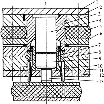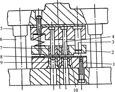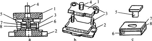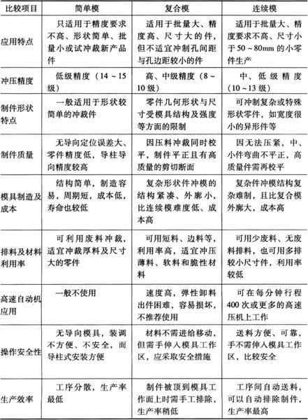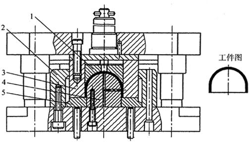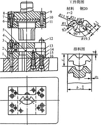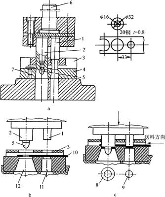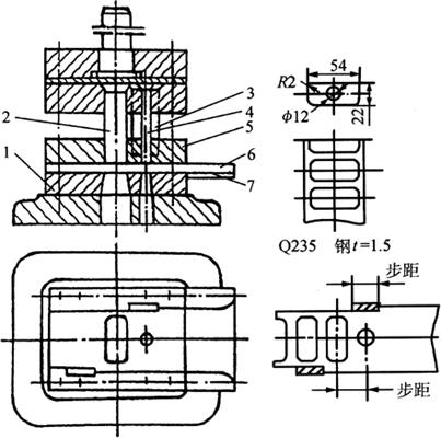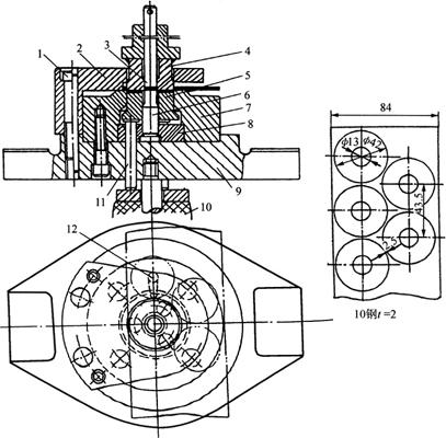 释义 | 冲模结构原理及应用 冲裁模最主要的工作元件是凸模和凹模,按其工序性质可分为落料模、冲孔模、切断模、切边模等多种形式,并按工序的复合程度又可分为简单模、连续模和复合模三种。 (一)简单冲裁模 简单冲模只有一对凸、凹模,在压力机的每次冲压行程中只能完成单一冲裁工序的冲模,也称为为单工序模,如图8-57为简单冲孔模、标准模架和其工作部分。例如冲制圆形垫圈时,需要使用两套简单模才能完成,一套冲孔模用于冲出垫圈的中间孔洞,一套落料模用于冲裁出垫圈的外形轮廓。 图8-57 简单冲孔模 a.冲孔模 b.模架 c.工作部分 1.上模座 2.下模座 3.导向装置 4.模柄 5.凸模 6.凹模 7.卸料板 8.导料尺 1.落料模 图8-58为导板式简单落料模,上模由模柄、上模座、垫板、凸模固定板和凸模组成。下模由下模座、凹模、导料板、挡料销和起导向作用的导向卸料板组成。 图8-58 导板式简单落料模(单位:mm) 1.下模座 2.销钉 3.导向卸料板 4.短销 5.挡料销 6.凸模 7.螺钉 8.上模座 9.销钉 10.垫板 11.凸模固定板 12.限位钉 13.导料板 14.凹模 导板模的特点是冲裁过程中上、下模两部分始终依靠凸模与导板间的配合导向,且配合间隙必须小于凸凹模间隙,通常取H7/h6间隙配合。 为了保证模具导向精度,可使用行程较小、可调的偏心式冲床,以保持压力机的行程不大于导板厚度;为了不影响导向精度,刃磨凸模时一般不脱离导板,因此下模部分应便于拆卸安装。导板模一般适用于形状较简单、尺寸不大的冲裁件。 2.冲孔模 图8-59为带小导柱与弹性卸料板的简单冲孔模。冲裁过程中,上模与下模两部分除依靠上模板上的导套和下模板上的导柱上下滑动进行导向外,为提高产品质量,还装有小导柱与弹性卸料板配合导柱与导套双重导向,适用于双冲小孔或高速冲孔。 图8-59 带小导柱和弹性卸料板冲孔模 1.凹模固定板 2.弹性卸料板 3.小导柱 4.凸模 5.导套 6.导柱 7.淬火套 8.导尺 9.凹模 10.挡料板 该模具的工作部分为凸模、凹模固定板,定位及挡料部分为导尺、挡料板,卸料装置为弹性卸料板,导向装置为导套、导柱、小导柱,弹性卸料板也兼起凸模导向作用。 矩形毛料由前向后送进时,左右靠导尺导向,后面有挡料板定位。冲孔后凸模将废料由凹模孔推下,弹性卸料板将箍在凸模上的零件卸下。 (二)连续冲裁模 连续冲模又称级进模或跳步模,是在压力机一次行程中依一定顺序,在同一模具的不同工位上完成冲孔和冲外廓两道以上工序,冲外廓时即以中间冲出的孔定位毛料,这样冲床每一冲程即可获得一个完整的零件。所以,连续模为多工序模,多用于生产批量大、精度要求不高、需要多工序冲裁加工的小零件。 1.销孔定位连续模 图8-60为带导正销的冲制垫圈的连续模,工作时先用始冲挡料销初步定位,待落料凸模下行时,再由装于其上的导正定位销插入预先冲出的定位孔内,上模向下运动,凸模完成冲孔,并将冲孔废料从凹模孔中推下。 图8-60 带导正销的连续冲裁模(单位:mm) a.垫圈连续冲裁模 b.准备工作 c.完成一个行程 1.冲孔凸模 2.落料凸模 3.导板 4.凹模 5.导正销 6.上模固定 7.始冲挡料销 8.成品 9.废料 10.坯料 11.冲孔凹模 12.落料凹模 松开弹性始冲挡料销,条料从右向左送进一个步距(两凸模中心线距离)至第二工位,被固定挡料销阻挡定位,上模二次下行,导正定位销插入第一步冲得的孔中,凸模完成垫圈落料,与此同时冲孔凸模又冲了一孔。 当上模每次回程时,卸料板从凸模上推下废料。每条料冲完第一孔后不再用始冲挡料销,以后只靠固定挡料销定位,每次行程落下一个垫圈,并冲得一个孔(图8-60c)。 采用挡料销和导正销定位时,挡料销仅起初步限定条料位置的作用,真正起定位作用的是导正销。 2.侧刃定位连续模 若材料太薄或落料凸模径向尺寸太小,以及窄长零件都不宜用导正销可采用侧刃定位。如图8-61所示,工作部分为凹模、落料凸模、冲孔凸模,定位及挡料部分为侧刃、导尺、托板,导板既是卸料装置,又是导向装置。 图8-61 侧刃定位连续冲裁模(单位:mm) 1.凹模 2.落料凸模 3.侧刃 4.冲孔凸模 5.导板 6.导尺 7.托板 该模具装有左右两侧刃,右边的侧刃代替了始冲挡料销。侧刃在压力机的每次行程中,沿条料边缘裁下长度等于步距的料边,使剩余条料上左右侧刃导尺间成左窄右宽的凸肩状,且只有侧刃切去料边后条料才能向前送进一个步距。 冲裁工作时,条料自右向左沿导尺送进,至右面侧刃孔被挡停留,上模下行完成冲孔及侧刃切边,条料成凸肩状后可向前送进一个步距,冲得孔后的凸肩状条料便移至落料凸模的下方,上模第二次下行,冲得矩形零件并从凹模孔中推下;同时,冲孔工步又冲得一孔,侧刃又切去一料边,条料继续送进下一工步。从这时起,左侧刃才开始定位,凸模向上回行,箍在凸模上的条料被导板卸下。 (三)复合冲压模 复合模是指压力机一次行程中,在模具的一个工位上同时完成几道不同工序的模具,既可有冲裁也可有弯曲成型,属于多工序模。 例如用复合模冲制垫圈,是将冲孔与冲外廓两个工序复合在一起,下模既是冲孔的凹模,又是冲裁外廓的凸模,称为凸凹模,且凸凹模装在下模上称为倒装复合模,冲孔废料有凸凹模孔向下排出,反之则为正装复合模,向上出件。 采用复合冲压模冲制时,冲床每一行程可冲出一个零件,冲出的零件内孔与外廓的相对位置精度高,零件更平整。