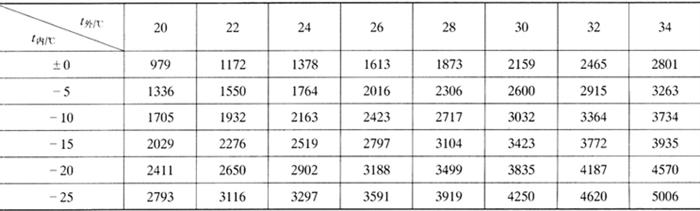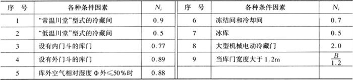 释义 | 冷库运转操作热的计算 (一)照明耗冷量Q4-1 Q4-1=q4-1A (kJ/h) (4-4-16) 式中 A——冷库面积,m2 q4-1——单位照明面积耗冷量,kJ/(m2·h),按表4-4-19取值 表4-4-19 单位面积照明耗冷量 (二)动力机械运转发热耗冷量Q4-2 Q4-2=3.6×105Pη (kJ/h) (4-4-17) 式中 P——各种机械所配电动机功率,kW η——效率因素,电机安装在冷却间内,η=1.0,安装在川堂η=0.75 (三)库门开启耗冷量Q4-3 Q4-3=qmZNi (kJ/h) (4-4-18) 式中 qm——库门每开启1h的耗冷量,kJ/h,按表4-4-20取值 表4-4-20 冷库门1h耗冷量qm 单位:kJ/h Z——库房使用系数,按表4-4-21取值 表4-4-21 库房使用系数Z值(相当于每天许可库门开启小时数) Nj——库房条件系数,按表4-4-22取值 表4-4-22 各种条件下的使用系数Nj 注:B——宽度,m。 (四)库内操作工人耗冷量Q4-4 Q4-4=qrn (kJ/h) (4-4-19) 式中 qr——单位时间每人产生的人身热,kJ/(h·人),按表4-4-23取值 表4-4-23 操作工人单位时间产生的热量 n——库内同时期操作人数。当库房面积≤200m2,n=2~3;库房面积>200m2,n=3~4 (五)冷库操作总耗冷量Q4 Q4=K(Q4-1+Q4-2+Q4-3+Q4-4)(kJ/h) (4-4-20) 式中 K——同期操作管理系数。结冻间、冷却间、操作频繁的库房及面积小于100m2的冷藏间K=0.75,面积大于100m2的冷藏间K=0.5 |
