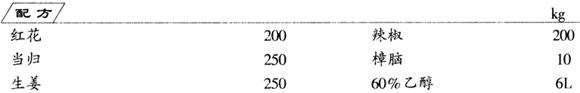 按配比先将红花、当归、生姜、辣椒轧成粗粉,混匀置容器内,加入60%乙醇5000ml,浸泡7天,压渣过滤备用。取樟脑10g溶于60%乙醇1000m1中,再与上述浸泡液混合,搅拌均匀,过滤,即成冻疮药水。