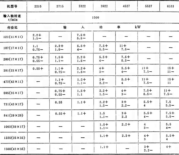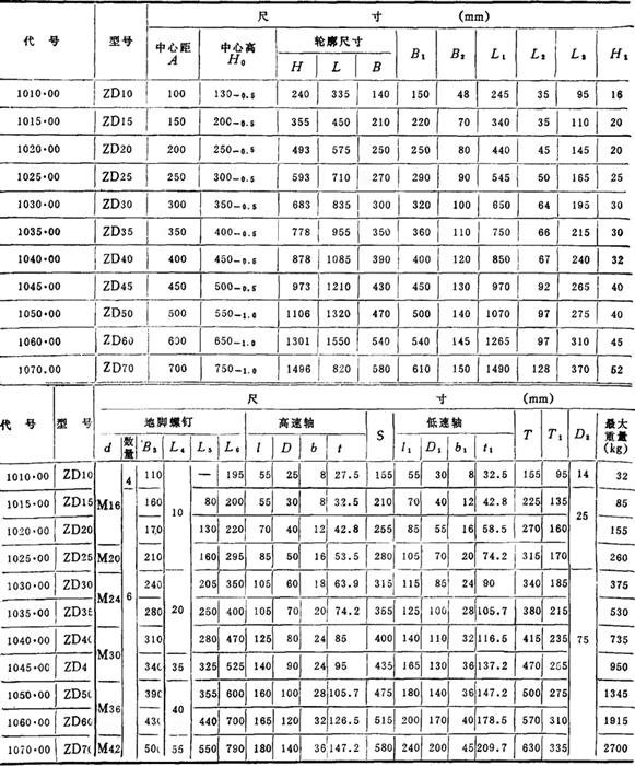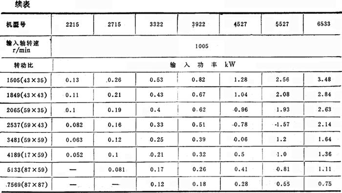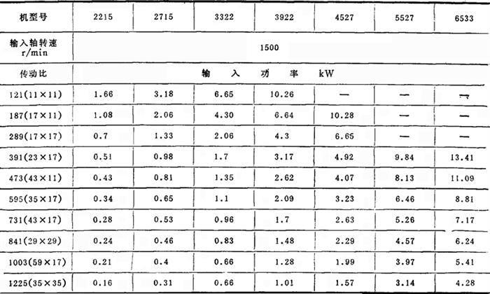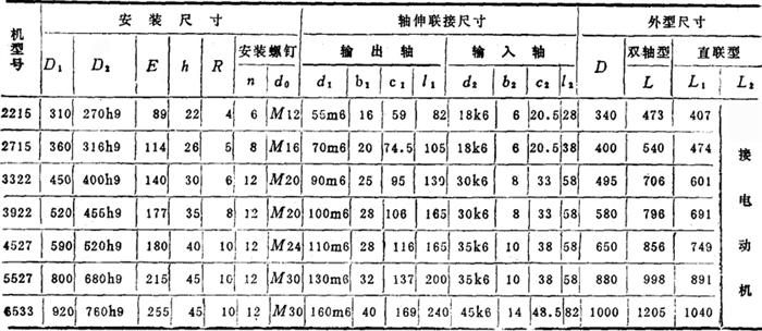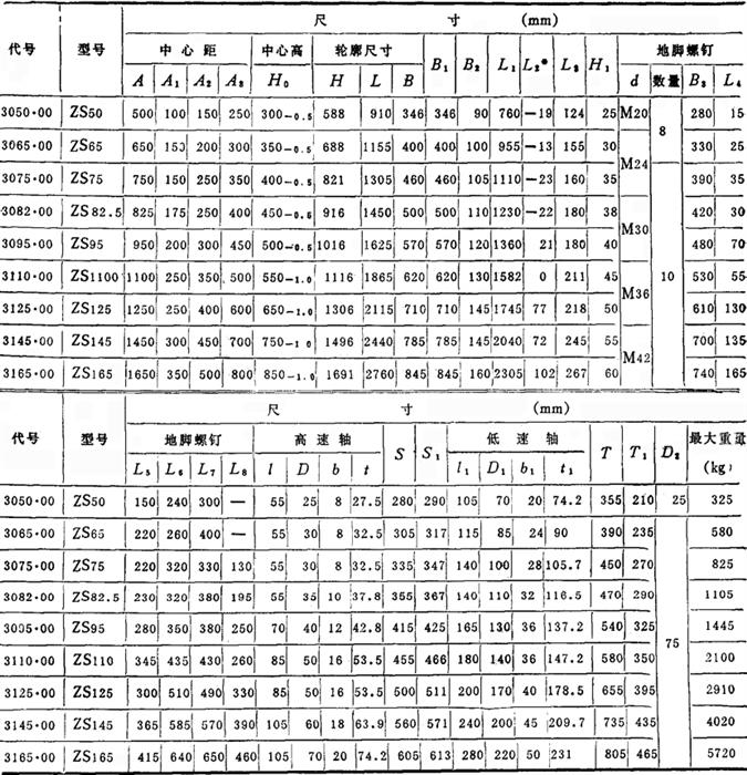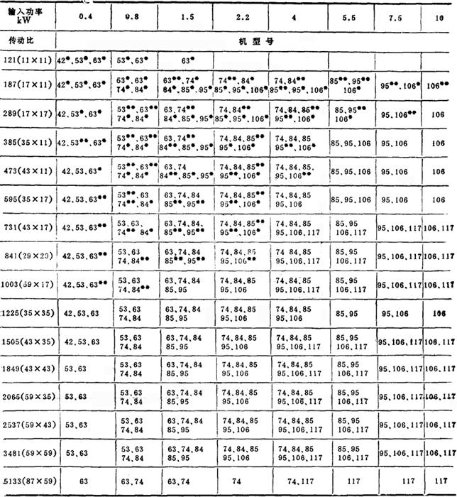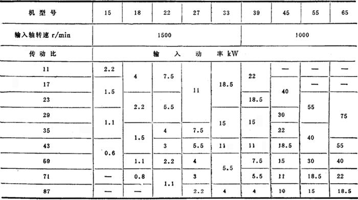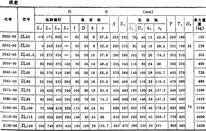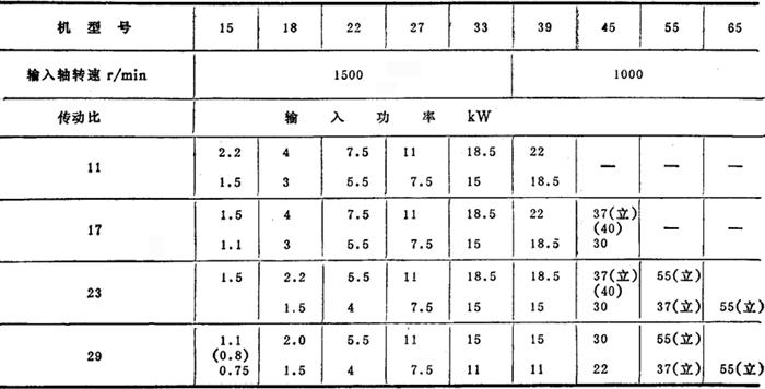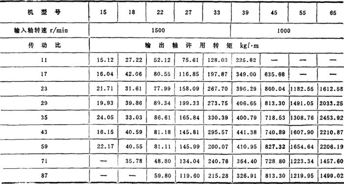 释义 | 减速机 减速机是原动机和工作机之间的独立的闭式传动装置,用来降低转速和相应地增大扭矩。在某些场合,也有用来增速的。减速机具有结构紧凑、传动效率高、传动准确可靠、使用维护方便等优点,在各种机械设备中应用甚广。这里仅列几种在制盐工业中常用的减速机。 (一)圆柱齿轮减速机 根据机械部标准JB1130-70规定,有3个系列的外啮合渐开线斜齿圆柱齿轮减速机,即ZD(单级)、ZL(两级)、ZS(3级)。其适用条件为: 减速机齿轮传动圆周速度不大于18m/s; 减速机高速轴的转数不大于1500r/min; 减速机工作的环境温度为-40℃到+45℃; 减速机用于正、反两向运转。 1.减速机的选用 已知条件:低速轴扭矩M(或高速轴功率N1)、高速轴转数n1、低速轴上转数及扭矩变化图、最大尖峰负荷、传动比i、寿命、装配型式。 选用程序: (1)根据传动比i选择ZD、ZL、ZS减速机。 (2)决定工作类型:查表3-5-9。 表3-5-9 减速机的工作类型 注:(1)寿命按10年计算。 (2)中型、重型和特重型每一循环的工作时间t工作不应超过20min,否则应按连续型计算。 (3)下标O——工作;C——循环。 (3)按减速机的工作类型和高速轴转数n1选出低速轴的许用扭矩并确定中心距。 (4)核算尖峰负荷 最大许用尖峰负荷为连续型承载能力的3.1倍。最大许用尖峰负荷在一个工作循环期内连续作用时间不应超过工作时间t工作的3%,同时在这一短暂的时间内,小齿轮进入啮合的次数不应超过500次。 (5)确定传动齿轮精度等级,写出所选减速机的代号。 2.减速机的代号 包括减速机的型号、总中心距、传动比、装配型式及齿轮精度等级。 减速机型号——ZD表示单级传动的圆柱齿轮减速机。 ——ZL表示两级传动的圆柱齿轮减速机。 ——ZS表示三级传动的圆柱齿轮减速机。 总中心距——用实际数字表示,cm。 传动比代号——用阿拉伯数字1、2、3……顺序表示。 装配型式代号——用罗马数字Ⅰ、Ⅱ……顺序表示。 齿轮精度等级代号-—表示减速机第一级传动齿轮精度等级。 8-7-7-Dc用“A”表示。 8-8-7-Dc不予表示。 例如 3.结构尺寸: 装配型式及外形尺寸: ZD 减速机见图3-5-25,表3-5-10 图3-5-25 ZD型圆柱齿轮减速机 表3-5-10ZD圆柱齿轮减速机外形尺寸 ZL 减速机见图3-5-26,表3-5-11 图3-5-26 ZL型圆柱齿轮减速机 表3-5-11 ZL型圆柱齿轮减速机外形尺寸 ZS 减速机见图3-5-27,表3-5-12。 图3-5-27 ZS型圆柱齿轮减速机 表3-5-12 ZS型圆柱齿轮减速机外形尺寸 带负号的尺寸在高速轴轴心线的右侧,不带负号的尺寸置位与图示位置相同。 4.中心距及公称传动比: (1)中心距应符合表3-5-13、表3-5-14、表3-5-15的规定。 表3-5-13 单位:mm 表3-5-14 单位:mm 表3-5-15 单位:mm ①ZD减速器的中心距A(表3-5-13) ②ZL减速器的中心距A(表3-5-14) ③ZS减速器的中心距A(表3-5-15) (2)公称传动比应符合表3-5-16、表3-5-17、表3-5-18的规定。 表3-5-16 表3-5-17 表3-5-18 ①ZD减速器的公称传动比i ②ZL减速器的公称传动比i ③ZS减速器的公称传动比i 减速机的实际传动比与公称传动比的偏差:当i=2~4.5时,不大于±2.5%;i=5~280时,不大于±4%。 (二)摆线针轮减速机 减速比大,单级传动比为11~87,双级传动比为121~7569;结构紧凑、体积小、重量轻、摆线针轮减速机与同功率的两级普通圆柱齿轮减速机相比,体积可减小 1.B系列摆线针轮减速机 根据机械部标准JB2982-81规定,有BW、BL、BWY、BLY单级和双级摆线针轮减速机。 (1)减速机的代号 BW——摆线针轮减速机,双轴型,卧式安装。 BL——摆线针轮减速机,双轴型,立式安装。 BWY——摆线针轮减速机,异步电动机直接联接型,卧式安装。 BLY——摆线针轮减速机,异步电动机直接联接型,立式安装。 机型号——用针齿中心圆直径cm表示(双级减速机按低级,高级连续表示)。 传动比——用阿拉伯数字表示(双级减速机用低速级传动比×高速级传动比表示)。 配用电机功率kW(双轴型不予表示) 例如: (2)减速机的主要参数 ①单双级减速机的针齿中心圆直径Dz应分别符合表3-5-19和表3-5-20的规定。 表3-5-19 单位:mm 表3-5-20 单位:mm ②双轴型单级减速机的传动比和输入功率应符合表3-5-21的规定。 表3-5-21 ③电动机直联型单级减速机的传动比和输入功率,应符合表3-5-22的要求。 表3—5-22 注:(1)表中每一机型、每一传动比对应的输入功率中数值最大者(包括带括号者),为设计时输入功率;数值较小者,为可以配备的电动机功率。 (2)带( )者表示非Y系列电动机的功率。 (3)带(立)者表示仅立式减速机配备的功率。 ④双轴型双级减速机的传动比和输入功率应符合表3-5-223的规定。 表3-5-23 ⑤电动机直联型双级减速机的传动比和输入功率应符合表3-5-24的规定。 表3-5-24 注:表中带“+”者表示所配电动机的功率大于减速机的设计功率,减速机应在许用输出转矩内使用或设有过载保护装置;带“-”者表示所配电动机的功率小于减速机的设计计算。 ⑥单级减速机的输出轴许用转矩应符合表3-5-25的规定。 表3-5-25 表3-5-26 表3-5-27 单级卧式摆线针轮减速机外形尺寸(mm) 表3-5-28 双级卧式摆线针轮减速机外形尺寸(mm) 表3-5-29 单级立式摆线针轮减速机尺寸(mm) ⑦双级减速机的输出轴许用转矩应符合表3-5-26的规定。 (3)安装、联接及外形尺寸 ①单级卧式减速机(包括电动机联型)的安装、联接及外形尺寸见图3-5-28、表3-5-27。 图3-5-28 单级卧式摆线针轮减速机 ②双级卧式减速机(包括电动机联型)的安装、联接及外形尺寸