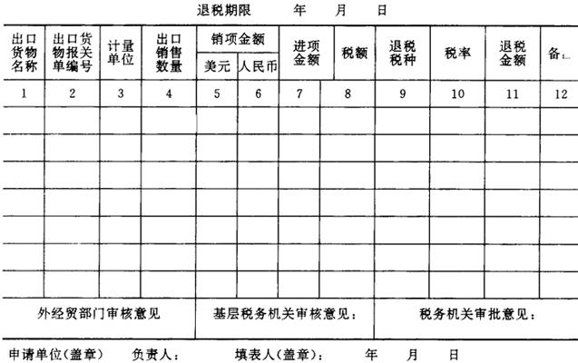 其他出口货物的进项税额依增值税专用发票所列的增值税税额计算确定。 八、外贸企业出口和代理出口货物的应退消费税税款,凡属从价定率计征消费税的货物应依外贸企业从工厂购进货物时征收消费税的价格计算。凡属从量定额计征消费税的货物应依货物购进和报关出口的数量计算。其计算退税的公式为: 应退消费税税款=出口货物的工厂销售额(出口数量)×税率(单位税额) 有出口经营权的生产企业自营出口的消费税应税货物,依据其实际出口数量予以免征。 九、出口货物的销售金额、进项金额及税额明显偏高而无正当理由的,税务机关有权拒绝办理退税或免税。 十、计算出口货物应退增值税款的税率,应依《中华人民共和国增值税暂行条例》规定的17%和13%税率执行。对从小规模纳税人购进特准退税的货物依6%退税率执行,从农业生产者直接购进的免税农产品不办理退税。 计算出口货物应退消费税税款的税率或单位税额,依《中华人民共和国消费税暂行条例》所附《消费税税目税率(税额)表》执行。 企业应将不同税率的货物分开核算和申报,凡划分不清适用税率的,一律从低适用税率计算。 十一、出口企业应持对外贸易经济合作部及其授权单位批准其出口经营权的批件和工商营业执照于批准之日起三十日内向所在地主管退税业务的税务机关办理退税登记证。过去已办理退税登记的出口企业在本办法下达后三十日内按新的规定重新认定。未办理退税登记或没有重新认定的出口企业一律不予办理出口货物的退税或免税。 出口企业如发生撤并、变更情况,应于批准撤并、变更之日起三十日内向所在地主管出口退税业务的税务机关办理注销或变更退税登记手续。 十二、出口企业应设专职或兼职办理出口退税人员,(以下简称办税员),经税务机关培训考试合格后发给《办税员证》。没有《办税员证》的人员有得办理出口退税业务。企业更换办税员,应及时通知主管其退税业务的税务机关注销原《办税员证》。凡未及时通知的,原办税员在被更换后与税务机关发生的一切退税活动和责任仍由企业负责。 十三、出口企业应在货物报关出口并在财务上作销售处理后,按月填报《出口货物退(免)税申报表》,并提供办理出口退税的有关凭证,先报外经贸主管部门稽核签章后,再报主管出口退税的税务机关申请退税。 十四、企业办理出口退税必须提供以下凭证: (一)购进出口货物的增值税专用发票(税款抵扣联)或普通发票。申请退消费税的企业,还应提供由工厂开具并经税务机关和银行(国库)签章的《税收(出口产品专用)缴款书》(以下简称“专用税票”)。 (二)出口货物销售明细帐。主管出口退税的税务机关必须对销售明细帐与销售发票等认真核对后予以确认。 出口货物的增值税专用发票、消费税专用税票和销售明细帐,必须于企业申请退税时提供。 (三)盖有海关验讫章的《出口货物报关单(出口退税联)》。《出口货物报关单(出口退税联)》原则上由企业于申请退税时附送。但对少数出口业务量大、出口口岸分散或距离较远而难以及时收回报关单的企业,经主管出口退税税务机关审核财务制度健全且从未发生过骗税行为的。可以批准缓延在三个月期限内提供。逾期不能提供的,应扣回已退(免)税款。 (四)出口收汇单证。企业应将出口货物的银行收汇单证按月装订成册并汇兑,以备税务机关核对。税务机关每半年应对出口企业已办理退税的出口货物收汇单证清查一次。在年度终了后将企业上一年度退税的出口货物收汇情况进行清算。除按规定可不提供出口收汇单的货物外,凡应当提供出口收汇单而没有提供的,应一律扣回已退免的税款。 下列出口货物可不提供出口收汇单: 1.易货贸易、补偿贸易出口的货物; 2.对外承包工程出口的货物; 3.经省、自治区、直辖市和计划单列市外经贸主管部门批准远期收汇而未逾期的出口货物。 4.企业在国内采购并运往境外作为国外投资的货物。 企业在国内销售货物而收取外汇的,不得计入出口退税的出口收汇数额中。 十五、外轮供应公司、远洋运输供应公司销售给外轮、远洋国轮的货物,按月向当地主管出口退税的税务机关报送《出口货物退(免)税申报表》,同时提供购进货物的增值税专用发票、消费税专用税票、外销发票和销售货物发票、外汇收入凭证。 外销发票必须列明销售货物名称、数量、销售金额并经外轮、远洋国轮船长签名方可有效。 十六、生产企业承接国外修理修配业务,应在修理修配的货物复出境后,向当地主管出口退税的税务机关报关《出口货物退(免)税申报表》,同时提供已用于修理修配的零部件、原材料等的购货增值税专用发票和货物出库单、修理修配发票、修理修配货物复出境报关单、外汇收入凭证。其应退税额按照零部件、原材料等增值税专用发票和货物出库单计算。 外贸企业承接国外修理修配业务后委托生产企业修理修配的,在修理修配的货物复出境后,应单独填报《出口货物退(免)税申报表》,同时提供生产企业开具的修理修配增值税专用发票,外贸企业开给外方的修理修配发票、修理修配货物复出境报关单、外汇收入凭证。其应退税额按照生产企业修理修配增值税专用发票所列税额计算。 十七、对外承包工程公司运出境外用于对外承包工程项目的设备、原材料、