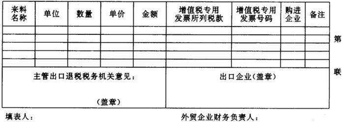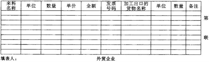 说明:1.此证明一式四联,由外贸企业填写,第一联由外贸企业交购料企业,第二联交主管出口退税的税务机关,第三联外贸企业留存,第四联交主管征税的税务机关。 2.此证明由国家税务总局各分局印制,防伪标记暂用原出口产品专用税票上的激光全息防伪标记。 附件四: 进料加工贸易申报表 __税务局: 编号:__ 我公司销售下表所列料件,属于进料加工复出口贸易,请准许在销售发票上按规定税率计算注明税额,但不计征库、而由__从我公司的出口退税款中抵扣。