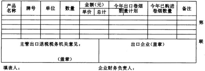 说明:1.此证明一式四联,第一联由外贸企业送主管其征税的税务机关,第二联主管退税的税务局留存,第三联外贸企业贸存,第四联交主管征税的税务机关。 2.此证明由国家税务局各分局印制。 附件五: 准予免税购进出口卷烟证明 __税务局: 编号:__ __公司需从__厂购买下表所列卷烟,用于国家计划内出口,请对上述卷烟免征增值税、消费税。