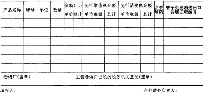 说明:此证明由购货企业填写,一式四联,第一联由主管购货企业的税务机关转主管,第二联主管购货企业退税的税务机关留存,第三联由购货企业转卷烟厂,第四联留购货企业。 此证明由国家税务总局各分局印制。 出口卷烟已免税证明 __税务局: 编号:__ __公司在__厂购进的下表所列卷烟,我局以按规定免征了增值税、消费税,请对上述免税卷烟予以监管。