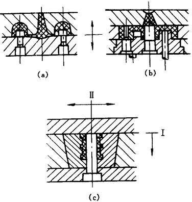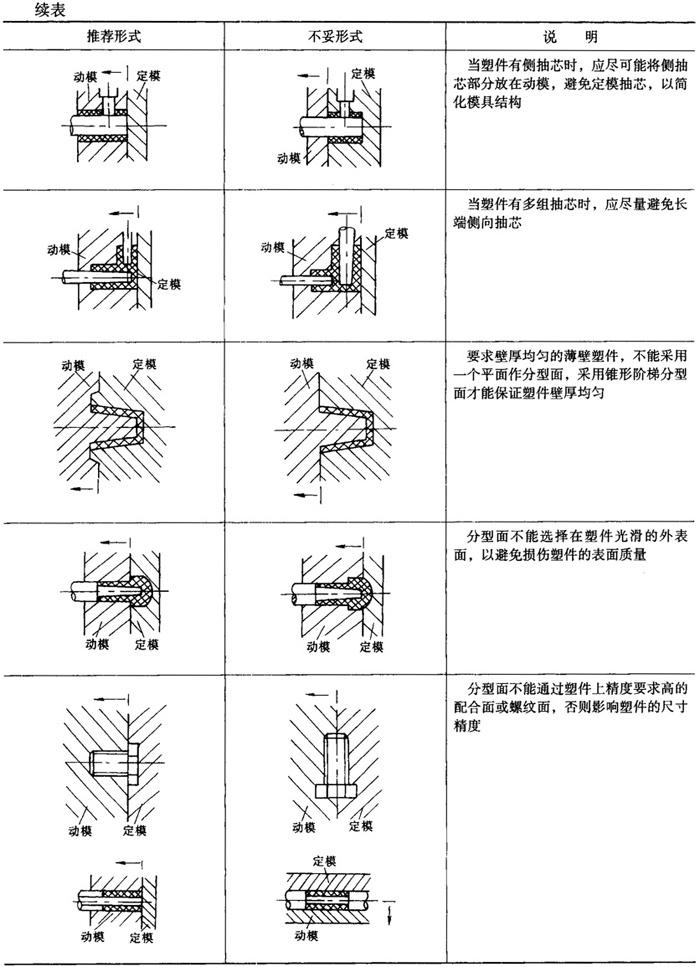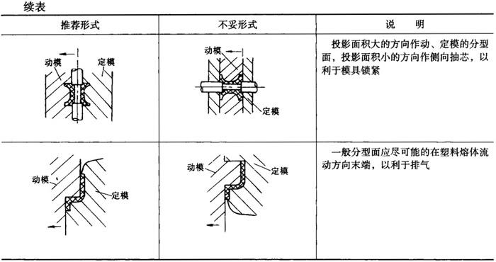 释义 | 分型面的设计 打开模具取出塑件或浇注系统凝料的面叫做分型面。注塑模有一个分型面和多个分型面。分型面的位置有垂直于开模方向、平行于开模方向以及倾斜于开模方向几种。分型面的形状有平面和曲面等。分型面的表示方法如图4-29所示。图4-29(a)表示分型面打开时,两边模板都作移动;图4-29(b)表示只有仅有动模板移动;图4-29(c)表示有多个分型面时,用罗马数字Ⅰ、Ⅱ等表示出分型的先后顺序。 图4-29 分型面的表示法 分型面应设在塑件断面尺寸最大的部位。典型分型面的选择见表4-15。 表4-15 典型分型面的选择 |