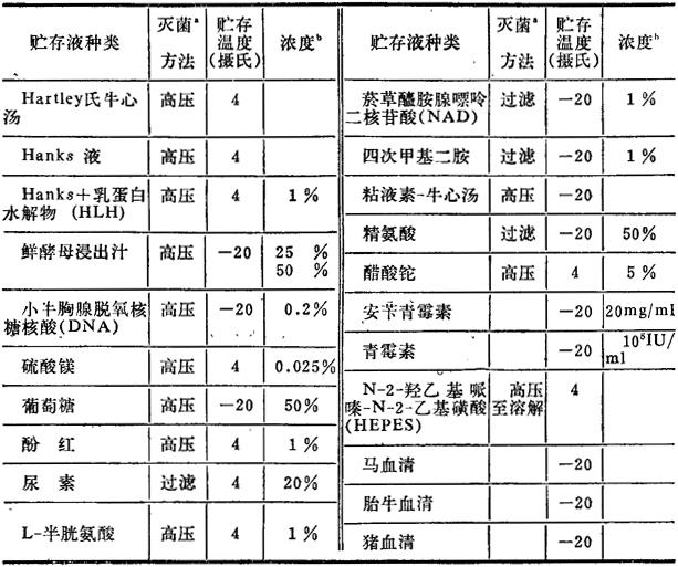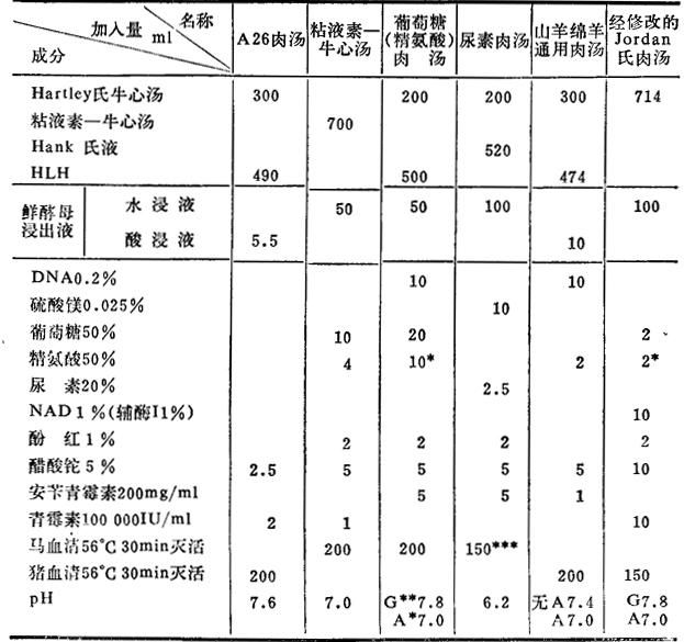 注:a.高压蒸气系115℃10min,过滤用6号玻璃滤器b.除乳蛋白水解物溶解于Hanks液中以外,其余均用无离子蒸馏水配制。 4.血清 健康猪或马血清,或胎牛血清,必须灭活,唯配制尿素肉汤的胎牛血清不需灭活。 表19-2 分离猪、牛、羊、禽霉形体的液体培养基