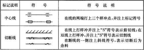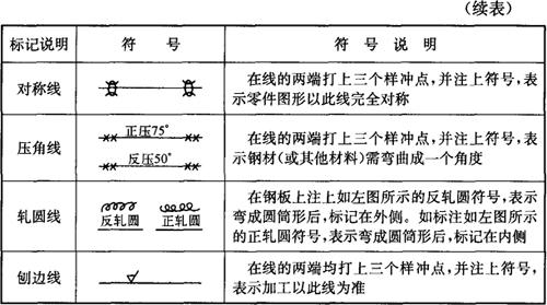 释义 | 划线的方法和常用符号、工具 1.划线的方法 划线的方法有实样法和比例法两种。工序间划线主要采用实样法。 (1)实样法 指直接在原材料或半成品上按样板或1∶1放样的办法划线。 (2)比例法 由人工或自动绘图仪在一些特定的材料(如纸)上,按比例画出图样,经光学等放大成1∶1图像投影在原材料上,再用人工或电印技术加以描绘。比例法便于纸面排料,效率高,可减轻劳动强度,适用于成批生产。但必须有相应的专业设备。 2.划线常用符号 常用的划线符号见表3-1。 表3-1 划线常用符号 3.工具 划线的工具分为自动划线和手工划线两类。自动划线的工具是一些专业设备或计算机及辅助设备等机械。一般有光电粉末划线、感光划线、电子划线、数字(计算机程序)划线。利用这些专业化的工具虽然所划的线精确且高效,但某种意义上受场地、划线尺寸等因素的影响,适用性被局限,而且成本也偏高一些。手工划线在实际工作中应用广泛,使用的工具通常有划针、石笔、圆规、长杆圆规、划规、粉线、直尺、角尺、样冲、划针盘、划线规、曲线尺、吊线锤、水平仪等。 |