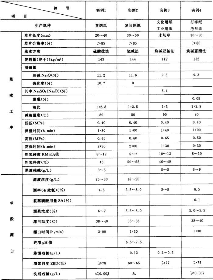 表5-7-30~31列出龙须草浆、蒸煮、漂白的几个实例。