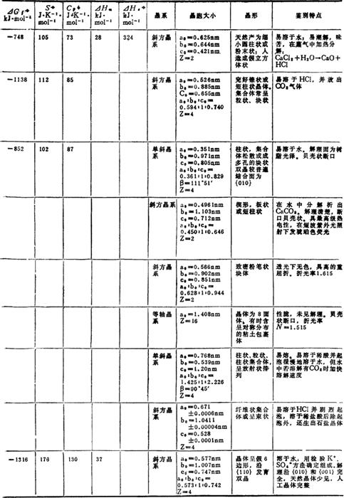 释义 | 制盐及盐化工业上一些盐类的性质、晶体结构和鉴定特点 制盐及盐化工业上一些盐类的性质、晶体结构和鉴定特点见表2-5-2。 表2-5-2 制盐及盐化工业上一些盐类性质晶体结构和鉴定特点 注:化学式=经验式或分子式。 Mr——分子量(相对分子质量),或式量。 ρ(g·cm-3)——密度。除另行注明外,都是指25℃状态下的。 tm(℃)熔点(d-分解,s-升华,*-加压下熔化:括号中的数值是估计值)。 tb(℃)——沸点。 溶解度——在25℃下每100g水中可溶解的无水物质的克数。表中:“不溶”指“实际不溶”。当物质带有结晶水时,溶解度是指该水合物在25℃下与其水溶液达到平衡时的数值;若水合物没有单独列出,则在溶解度数值后的括号里写出结晶水的分子数来表示该水合物的溶解度。 ⊿ ⊿ 水合离子的各项数据是在无限稀释的溶液中,相对于水合氢离子的对应数据为零而求得的。 S——固态;l——液态;g——气态;aq——无限稀释的水溶液。 ⊿Hm(kJ·mol-1)——摩尔熔化热,指1mol固态物质转变为液态所需的热量。 ⊿ ⊿H0(kJ mo-1)——由液体变为蒸气的摩尔蒸发热,即⊿ a0,b0,c0——轴单位(绝对长度) α,β,γ——轴角 Z——1个晶胞所含分子个数 |