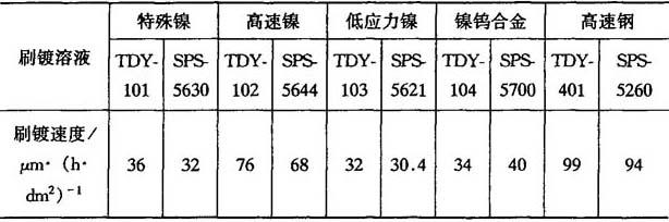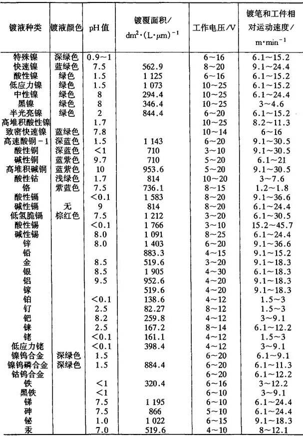 释义 | 刷镀设备及镀液 刷镀基本设备包括电源、镀笔及回转台等. 7.6.3.1 电源 刷镀所用电源与电解、电镀、电解磨削相似.电源电压在0~30V内连续可调,电解根据功率大小可在30~100A范围内选择.电流变化时,电压要相对稳定.为适应刷镀面积的不同,常把电流和电压分成几个等级配套使用:15A,20V;30A,30V;60A,35V;100A,40V. 刷镀电源上应有安培小时针,以便自动记录刷镀过程中所消耗的电量(电流×时间),并用数码管显示出来.它与镀层厚度成正比,当达到规定的消耗量(即达到预定尺寸)时,能自动报警,以控制镀层厚度.为进行工件表面的活化处理,直流电源的输出应能方便改变极性.为防止刷镀中镀笔与工件偶而短路出现损伤事故.电源中还应有短路快速切断保护和过载保护功能. 7.6.3.2 镀笔 镀笔是刷镀的主要工具.市售镀笔分大、中、小和旋转镀笔4种. 镀笔由导电手柄和阳极两部分组成.阳极和导电手柄一般用螺纹联接,或将阳极插入导电手柄中再用螺母拧紧.导电手柄上有散热器. 阳极用不溶性材料制成.一般用高纯石墨制成,因刷镀电流密度高,一般可溶性阳极易钝化影响导电性能.当阳极尺寸很小时,可用含铂90%的铂-铱合金作阳极,还可用不锈钢(适用于不含卤素及氰化物镀液)作阳极. 阳极表面要包一层脱脂棉、化学纤维、海棉及包套.其作用是贮存镀液;防止阴阳极直接短路产生电唬过滤阳极溶解下来的石墨粒子;擦掉工件上的疏松沉积层.包套用纱布或涤棉制造.注意不可用橡皮筋扎捆棉花,防止橡胶脱硫使镀层产生斑迹. 我国生产的几种镀笔及使用电流见表7-23. 表7-23 镀笔型号、作用电流及配用电缆截面积 7.6.3.3 刷镀液 按用途分,刷镀液可分为4大类:表面准备溶液、金属刷镀溶液、钝化溶液和退镀溶液. (1)表面准备溶液 ①电解除油溶液 电解除油溶液有较强的除油作用和轻度去锈能力,适用于所有金属.常用的电溶液TGY-1的主要成分如下:氢氧化钠5~10g/L,缓冲盐(Ⅰ)30~40g/L,缓冲盐(Ⅱ)0.5~3g/L,添加剂微量.pH值12~13,溶液呈碱性,无色透明.对于不同的基材只需改变电压和时间.钢铁:10~20V,30~60s(阳极);铜及其合金:8~12V,15~30s;白软金属:5~8V,5~10s. ②活化液 用来除去金属表面的氧化物,保证刷镀层有良好的结合强度.常用活化液配方见表7-24,使用范围见表7-25. 表7-24 常用活化液成分 表7-25 常用活化液的使用范围及工作条件 (2)金属刷镀溶液 ①刷镀液的特点:第一,刷镀液中金属离子浓度高,不能采用简单的无机盐混合液,而用有机络合物水溶液才能适应大电流密度刷镀;第二,在使用过程中,镀液中能进行化验和调整,要求在很宽的温度范围内保持沉积速度稳定;第三,刷镀主要用于修复超差零件和提高耐磨性,因此不加光亮剂. ②刷镀液的性能 刷镀液的种类很多,分酸性和碱性两大类,镀液的配方一般为专利.国内各种刷镀液的性能见表7-26. 表7-26 各种刷镀液的性能 6种常用刷镀液的主要工艺条件见表7-27. 表7-27 6种刷镀深液的主要工艺条件 各种刷镀液的平均沉积速度见表7-28. 表7-28 各种刷镀液的平均沉积速度 注:TDY系列为国产刷镀液,SPS系列为美国富来创公司产刷镀液. 刷镀液一般可循环使用,但使用过程中金属离子不断降低,沉积速度下降,继续使用不合算. (3)钝化溶液 刷镀镍、镉后需钝化处理.钝化液有两种:铬酸钝化液和硫酸盐及磷酸盐溶液.市售铬酸钝化液使用时应稀释1倍,浸刷在锌或镉镀层上,数秒后用水冲洗干净. (4)退镀溶液 为了除去不合格的镀层或损坏的旧镀层,常用有Cu、Ni、Cr、CO、Zn退镀液,其性能见表7-29. 表7-29 退镀溶液的性能 注:退铜时不必通电. |