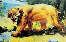 释义 | 剑齿虎(Machairodontinae) 古哺乳动物的一亚科。 属食肉目,猫科。形态和大小同现代的虎近似,但上犬齿比现代的虎发达得多,有的前后缘有锯齿,利如短剑。口能张得很大,利于捕食象、犀之类的厚皮动物。上下裂齿成剪刀状排列,利于剪断肌肉。四肢远端为利爪,不耐长跑。生存于亚欧大陆的第三纪晚期及更新世。 化石在中国河北、河南、山西、云南等地均有发现。 剑齿虎犬齿(复原形态) 剑齿虎 (还原图) |