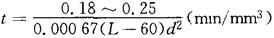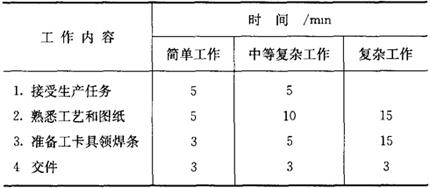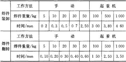 释义 | 劳动工时定额 1.劳动工时定额的概念及其构成 劳动定额是在一定的生产技术组织条件下,为完成某项工作所规定的必需的劳动消耗的标准量。劳动定额的研究和制定与具体的生产技术组织条件有密切的关系,也就是说劳动定额是与生产的各项要素,如劳动力水平(包括工人的技术等级、文化素质等)、劳动对象(即原材料的特点或所生产产品结构工艺的复杂性等)和劳动工具(包括机械设备、工艺装备)等紧密相关的。 2.焊接结构生产劳动定额时间构成 根据时间消耗分类方法,焊接一批产品的定额时间计算公式为: T批=(T单件·N+T准)/60 焊接每米焊缝的定额时间计算公式为: T米缝=(T基+T′辅)·(1+K)·K1 焊接一件产品的定额时间计算公式为: T单件=[(T基+T′辅)L+T″辅]·(1+K)·K1 式中 T批——焊接一批产品的总定额时间(h); T准——一批产品的准备结束时间(min); N——一批产品的数量; T米缝——每焊接一米焊缝的定额时间(min/m); T基——焊接的基本时间,即熔化焊条或焊丝形成焊缝的时间(mm); L——单件产品的焊缝总长度(m); K——布置工作地及休息与自然需要时间占作业时间的百分数; K1——考虑到焊缝特点的一个系数,根据工作性质来决定其取值。 3.手工电弧焊时间定额的制定 (1)焊接基本时间影响因素的分析及计算 焊接的基本时间就是熔化焊条形成焊缝所消耗的时间。影响焊接基本时间量的因素为焊条的熔化速度v(g/min)和形成焊缝所需熔化的金属质量G(g)。焊接基本时间的计算公式为: 式中 T基——焊接基本时间(min); G——形成焊缝所需熔化的金属质量(g); v——焊条的熔化速度(g/min); α——焊条的熔化系数(g/A·h),α与焊条的牌号、电流的种类、焊缝在空间中的位置有关,如表8.3-5所示。 表8.3-5 熔化系数值 I——焊接电流强度(A),I与焊缝的特征、焊件的厚度、焊缝层数、焊条直径、焊条种类及焊缝的空间位置有关,如表8.3-6所示。 表8.3-6 焊接电流强度数值 F——焊缝的横断面积(mm2),F与焊缝的坡口形状和焊件的厚度有关,如表8.3-7所示。 表8.3-7 断面面积数值 (mm2) L——焊缝长度(m); γ——焊条金属的密度(g/cm3),焊皮电焊条取γ=7.6g/cm3;光焊条取γ=7.8g/cm3。 对分成几层焊接的厚度较大工件,此时焊接的基本时间须按层分别计算,然后再求其和,其计算公式如下式所示: 编制焊接时间标准时,为便于制表和使用,一般均按焊接每米焊缝的基本时间计算: 以上各式所求出的T基均为理论数值,实际焊接基本时间的消耗也要比上述计算的理论值大。由此,一般采用对焊缝横截面积进行修正的办法来解决: F=F理论·K 式中 F——为对理论面积进行修正后,用于计算定额的当量面积; F理论——理论面积; K——为考虑到焊缝表面的不平和焊条金属的流失、飞溅而采用的修正系数,K的值可参照表8.3-8来取。 表8.3-8 断面增大系数 (2)焊接辅助时间影响因素的分析及计算 手工电弧焊接辅助时间由与焊接有关的辅助时间和与焊缝无关但与工件有关的辅助时间两部分组成。与焊缝有关的辅助时间包括换焊条时间、检查与测量焊缝时间及清理焊缝和边缘时间。 换焊条时间:在焊接过程中,更换焊条所消耗的时间等于每更换一次焊条所消耗的时间与焊条更换次数的乘积。每更换一次焊条所需要的时间消耗可通过测时取得,一般情况下,平焊、立焊、横焊取0.18min/次;仰焊取0.25min/次。 焊条的更换次数可按下式计算确定: 式中 N——为焊条的更换次数; G——焊缝金属质量(g); g——每一根焊条实际能熔化的焊条金属质量(g); d——焊条金属直径(mm); L——焊条全长(mm); L1——焊条料头(废弃部分)长,一般L1=50~60(mm); K——由于焊缝金属的流失和飞溅所造成的焊条熔化部分金属的损失系数,一般取K=0.15~0.2; γ——焊条金属密度(g/mm3)。 转换上式,将各种数据代入则可求得熔化每立方毫米金属所分摊的更换焊条的时间消耗值,其计算公式如下: 为使用方便,今将各种不同直径的焊条按熔化每立方毫米焊条金属所分摊的更换焊条的时间列表8.3-9所示。 表8.3-9 熔化每立方毫米焊条金属的平均更换焊条时间 (min) 检查和测量焊缝时间:可通过测量时来取得,一般按焊缝的空间位置不同,以检查和测量每1m长焊缝所消耗的时间为单位来计算,如表8.3-10所示。 表8.3-10 检查和测量焊缝时间 (min) 清理焊缝和边缘时间:清理焊缝熔渣和修正焊缝所需时间消耗与焊缝空间位置、焊条种类、焊缝的施焊层数和焊缝截面积大小有关,可按下列经验公式计算确定。 T清=L[0.6+1.2(n-1)](min) 式中 L——焊缝长度(mm); n——施焊层数。 与工件有关的辅助时间包括焊件的装卡和卸下时间、在焊接中翻转焊件的时间、在焊接中的行走时间和在焊件上作标记(焊缝打印)时间。 焊件的装卸和翻转时间:焊件的装卸和翻转时间与焊件的质量和起重方法有关,可通过测时方法确定。表8.3-11所示为参考数据。 表8.3-11 焊件的装卸和翻转时间 行走时间:行走时间即在焊接过程中,工人变动工作位置所消耗的时间,这类时间消耗与工作条件、焊件大小和形状有关,可通过测时方法确定。表8.3-12为参考数据。 表8.3-12 行走时间 (min) 焊缝打印时间:这类时间消耗主要发生在对焊缝质量要求高的产品,如密封容器及受力构件等,通常打印一处可取0.25min。 (3)工作地布置、休息与生理需要时间的确定 工作地布置时间消耗按照对焊接作业时间的百分比确定。室内工作取3%;室外