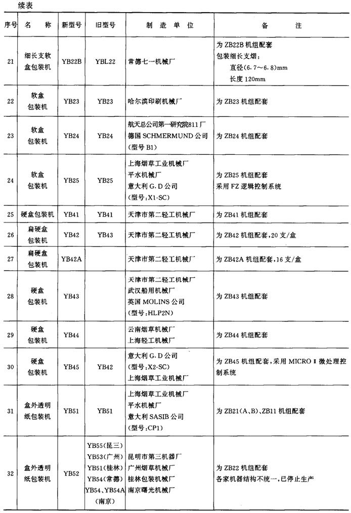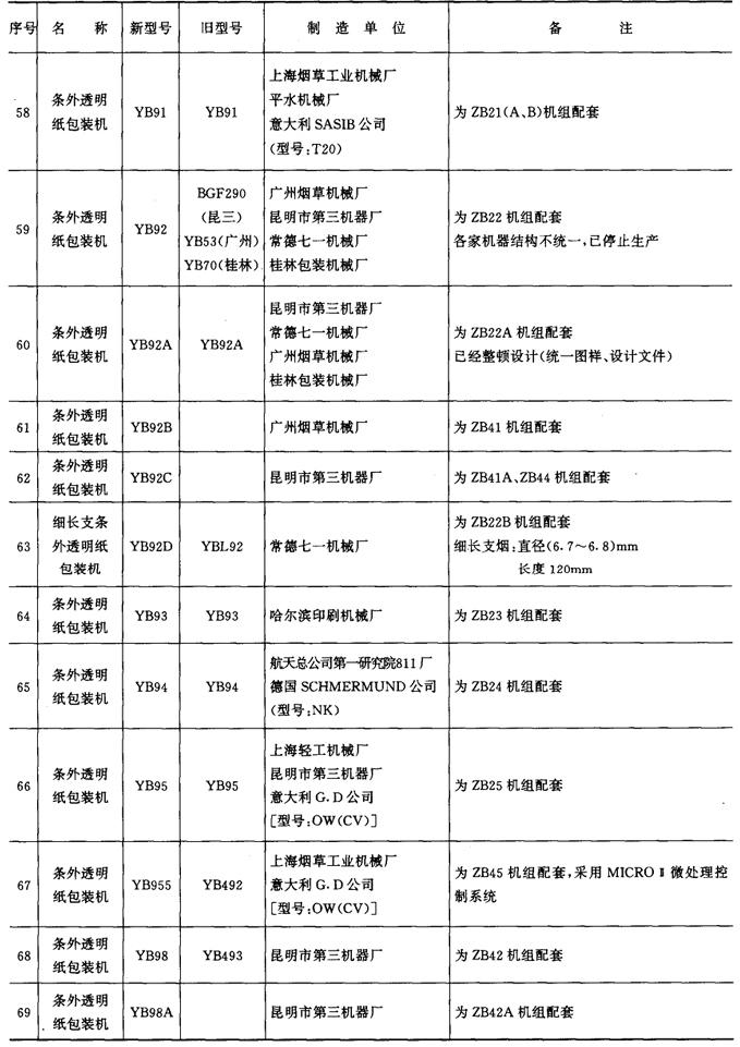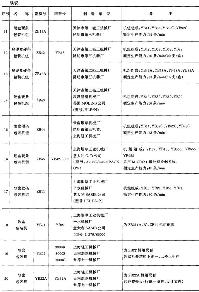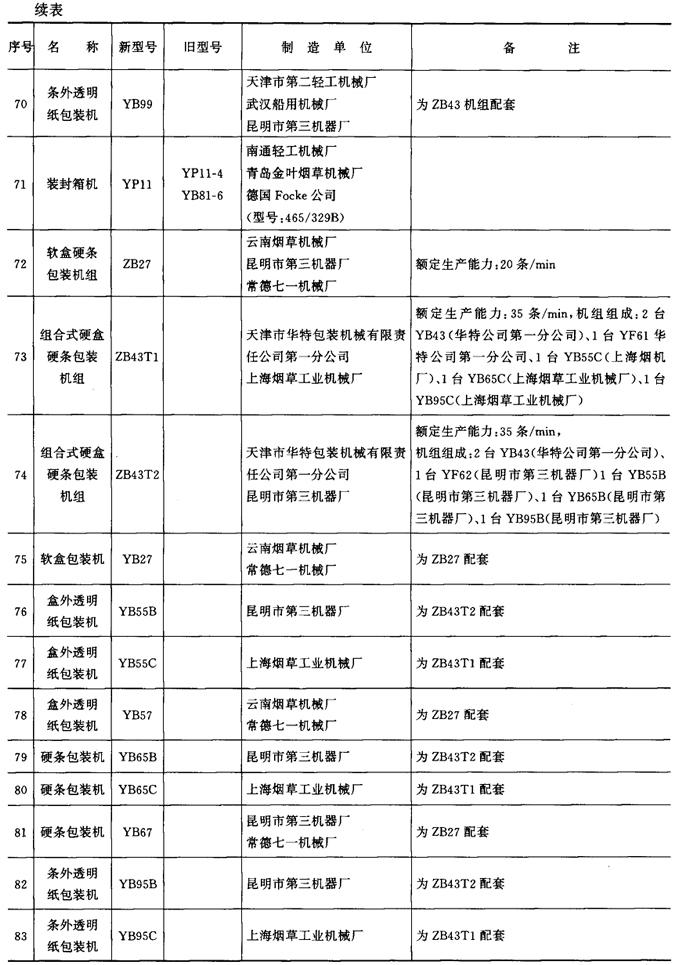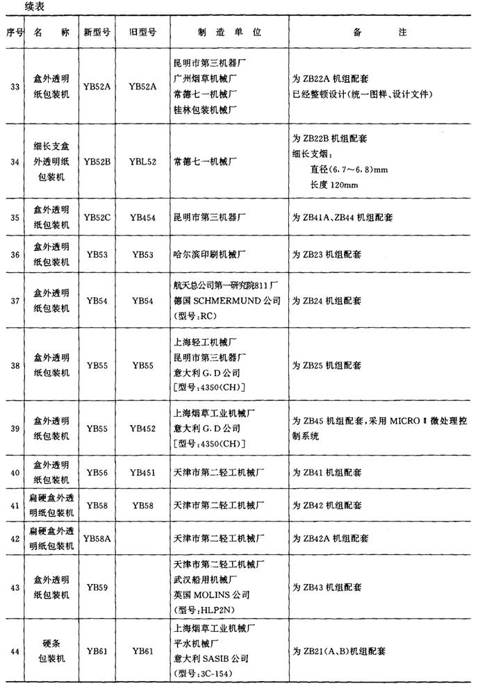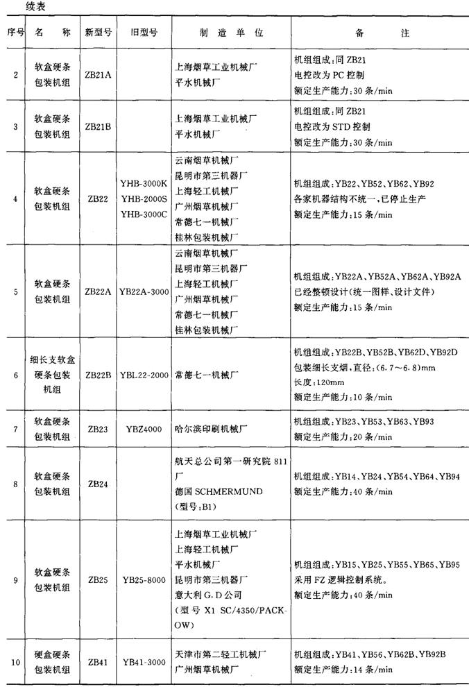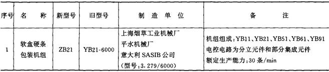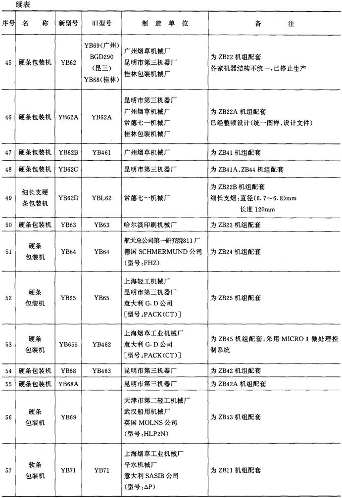 表9-4-1 包装机械产品型号一览表
