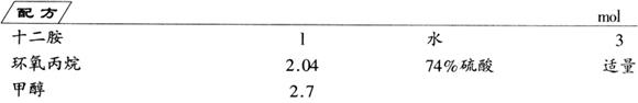 向带搅拌器的三颈烧瓶中加入十二胺和甲醇,在甲醇环境中,25~28℃条件下,将环氧丙烷分两次缓慢滴加。第一次滴加1mol的量,搅拌下反应5h,放置过夜,第二次再滴加1mol的量,再搅拌5h。因为环氧丙烷极易挥发,当室温较高时,需于反应过程中分两次各补加0.02mol环氧丙烷,以保证反应完全。反应完毕,常压下蒸出甲醇和水,甲醇回收率为70%。