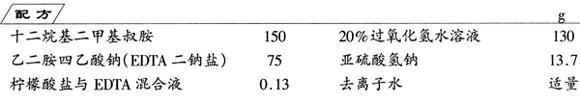 150g十二烷基二甲基叔胺和75g水加入到四颈烧瓶中,搅拌,升温至60℃,再加入定量的EDTA二钠盐和催化剂(柠檬酸盐和EDTA二钠盐的混合液)。搅拌均匀后开始滴加过氧化氢水溶液,控制在2h内滴完,滴加过程中不时加入去离子水以防止凝胶。加完后温度保持60~75℃,搅拌反应1~2h。降温到60℃,加入计算量的亚硫酸氢钠,分解残留的过氧化氢,降温即得产物,产率99%,有效物含量30%±1%。本法也可以放大到500L搪玻璃反应釜中进行制备。