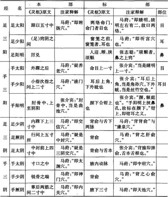 释义 | 十二经标本 《灵枢·卫气》中具体载述了十二经标本的内容,并称“能知六经标本者,可以无惑于天下”。金元医家窦默在《标幽赋》中也称:“依标本而刺无不痊”。可见其内容对指导针灸临床的重要意义。十二经标本内容见表2-50。 表2-50 十二经标本表 注 上表诸注家,马莳注据《灵枢注证发微》;张介宾注据《类经》;张志聪注据《灵枢集注》 从表2-50中可以看出十二经的本部都在四肢肘膝关节以下,所以四肢肘膝关节以下部位亦称为“本”部。十二经的标部都在躯干,所以躯干是人体的“标”部。清代医家张志聪将这种标本关系解释为:“标者,犹树之梢杪,杪绝而出于络外之径路也;本者,犹木之根干,经脉之血气从此而出也。”又说:“十二经脉之本标,乃经脉之支别,故曰此气之大路也,路绝则径通。盖血气从络脉之起处为本,尽处为标,而出于气街也。”故十二经标本,也可以认作是十二经脉的另一络脉系统。这一系统说明血气以四肢肘膝关节以下为根干,以头身躯干部的头气之街与胸腹气街(参见2.4.3节)为标梢。其中手足三阳(腑)经之标部均在头气之街。而阳明在颜面鼻部;少阳在窗笼耳部;太阳在命门目部。其标梢所出皆与经脉循行所止之处相符,即皆在头面外行经脉(外经)所过处。而手足六阴经之标部在胸气之街与腹气之街,而手三阴在胸气所止之膺与背部背俞,足三阴在腹气所止的腰部背俞,即均与其经脉所属的内脏气相通应。这种经脉的标本关系对指导认识十二经脉病候与主治功能,以及释解本(五)输穴的含义均有十分重要的理论价值。将在2.4.4节中集中讨论。 |