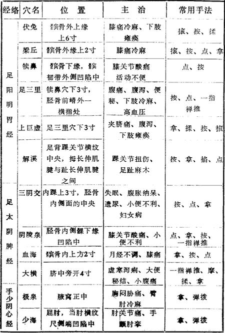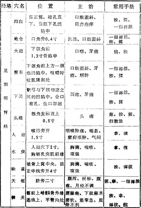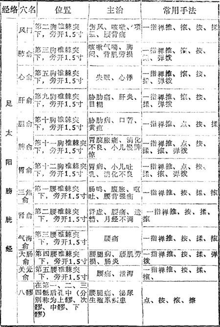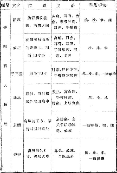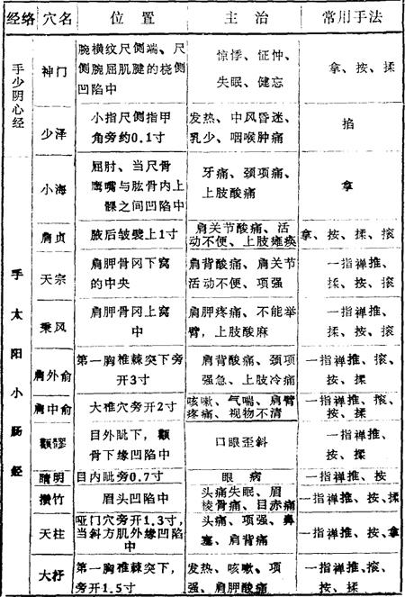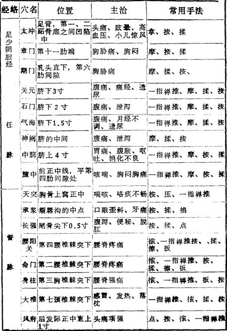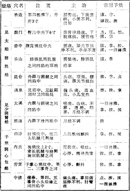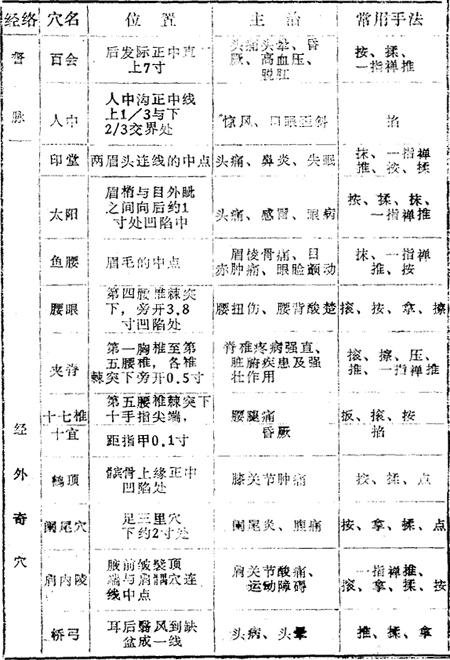| 释义 | 十四经穴和经外奇穴 十四经穴和经外奇穴在按摩的临床运用中极为广泛,多在成人按摩中运用,小儿推拿中也常选用,它对按摩治疗各种疾病有重要的影响。因为穴位选择的正确与否,直接影响着治疗的效果,故我们必须熟练掌握。有关十四经穴和经外奇穴在按摩中的常用腧穴见下表: 常用腧穴表