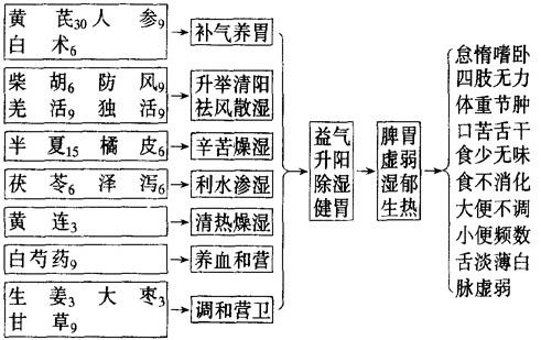 释义 | 升阳益胃汤 【药物出处】:《内外伤辨惑论》·益气升阳法 【处方】: 【要点】 本方在补中益气汤基础上加重化湿力度,补中有散,升中有降,更宜于湿郁三焦而清阳不升之证。 【应用】 1.胃炎。 2.胃粘膜脱垂症。 3.荨麻疹。 4.其它原因不明的发热。 【注意】 1.方中风药用量宜小,否则主次倒置,非但不能升阳,反使脾胃更虚。 2.药后忌油腻,宜进食富有营养、易消化之品。 3.药后应轻微活动,以推进药力和食物的消化吸收,慎勿劳倦太过。 【类方】 升阳汤(《脾胃论》):由柴胡、益智仁、当归身、橘皮、升麻、甘草、红花组成。功能益气升阳,温脾止泻。主治大便一日三四次,溏而不多,有时泄泻,腹中肠鸣,小便黄。 |