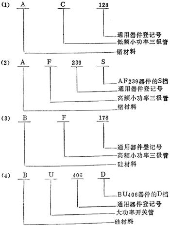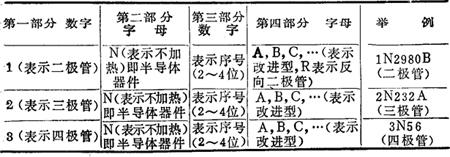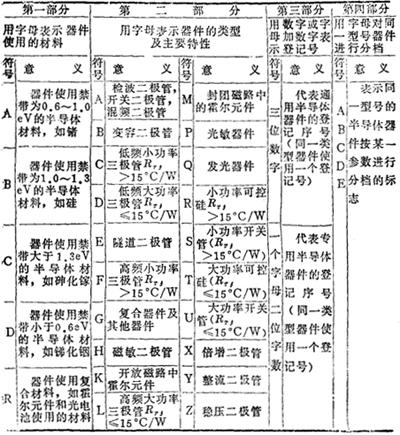 释义 | 半导体分立器件型号命名方法 由于半导体分立器件型号命名方法世界各国并不统一,现简要介绍如下: (一)中国 1.主要内容 中国半导体分立器件的型号命名采用国家标准GB249-74《半导体器件型号命名方法》。该标准规定半导体器件的型号由五个部分组成,其各部分的含义如下: 第一部分:用阿拉伯数字表示器件的电极数目; 第二部分:用汉语拼音字母表示器件的材料和极性; 第三部分:用汉语拼音字母表示器件的类型; 第四部分:用阿拉伯数字表示序号; 第五部分:用汉语拼音字母表示规格号。 以上五个部分所用符号及其含义见表15-1。 表15-1 半导体器件型号组成部分的符号及其意义 2.说明 场效应器件、半导体特殊器件、复合管、PIN型管、激光器件的型号只有第三、第四、第五部分。 3.应用举例 1)锗PNP型高频小功率三极管 (二)苏联 1.概述 目前苏联半导体器件型号命名方法使用的是苏联国家标准(TOCT)10862-72命名法。它的特点是命名方法比较合理和确切,一般根据半导体分立器件的型号就能了解其基本特性。 2.符号及其含义(表15-2) 表15-2 苏联(原)半导体器件命名法 3.附加说明(表15-3) 表15-3 器件的基本参数分类 (1)表15-3中有关三极管特性的分类标准为:按集电极最大耗散功率PCM的大小划分为小、中、大功率管。 PCM≤0.3W为小功率管; 0.3<PCM≤1.5W为中功率管; PCM>1.5W为大功率管。 按特征频率fr的高低划分为低、中、高、特高频管。 fT≤3MHz为低频管; 3<fT≤30MHz为中频管; 30<fr≤300MHz为高频管; fr>300MHz为特高频管。 (2)表中开关二极管的反向恢复时间τ恢复是指二极管由正向导通状态急剧转变到截止状态所需的时间。 (3)表15-3有关整流器件与可控硅的分类标准为:按额定正向整流电流的平均值(IF)划分为小功率管与中功率管: IF≤0.3A为小功率管: 0.3<IF≤10A为中功率管; IF>10A的大功率管不按此标准命名。 (4)表中稳压二极管按其最大耗散功率PzM划分为小、中、大功率管: PzM≤0.3W为小功率管; 0.3<PzM≤5W为中功率管; PzM>5W为大功率管。 (5)表15-3中发光器件的亮度单位为尼特(Nit)。 4.应用举例 (三)美国 由于美国工业生产各自为政,因而半导体器件型号命名方法亦很混乱。后来美国联合电子器件工程委员会(J.E.D.E.C)制定了一种标准型号,现被许多厂家采用。其中二极管、三极管及四极管型号组成部分的符号及意义见表15-4。 表15-4 美国二极管、三极管、四极管型号组成部分的符号及其意义 (四)日本 日本半导体器件型号命名方法是由日本中央电气协会(CES)统一制定的,共有五个部分组成,其排列顺序见表15-5。 表15-5日本半导体器件型号排列顺序 第一部分:数字0为光电晶体管及光电二极管,数字1为二极管,数字2为晶体三极管及控制整流器件。 第二部分:拉丁字母,通常为S(semiconductor)表示半导体器件。 第三部分:拉丁字母用以表示晶体管的结构和类型。各字母意义如下: A——高频PNP型三极管及快速开关三极管; B——低频及大功率PNP三极管; C——高频及快速开关NPN三极管; D——低频及大功率NPN三极管。加注fα>5MHz者作为高频,若PC大于1W,即作为大功率; F——P型闸选PNPN开关管; G——N型闸选NPNP开关管; H——专用晶体管。 第四部分:数字,2~3位表示工厂产品注册登记顺序号。自11往上累加。 第五部分:拉丁字母,作为辅助标记,表示同一种型号的晶体管改进型。 根据上述命名法,可容易地识别日本半导体产品型号。例如2SA53为高频PNP型三极管,2SB77C则表示低频PNP型三极管2SB77的改进型,1S92表示半导体二极管。 (五)国际电子联合会 1.主要内容 目前,参加欧洲共同市场的德国、法国、意大利、荷兰等国家和一些东欧国家,如匈牙利、罗马尼亚、南斯拉夫、波兰等,其半导体器件型号命名使用的是国际电子联合会的标准半导体分立器件型号命名方法。该方法规定半导体器件型号由四个基本部分组成。这四个基本部分的符号及其意义见表15-7。除基本组成部分外,为进一步标明半导体器件的特性,或对器件进一步分类,有时还加有后缀。按规定后缀用破折号与基本部分分开。常用的后缀有以下几种: (1)稳压二极管型号后缀的第一部分是一个字母,用来表示器件标称稳定电压值的容许误差范围。字母及其代表意义见表15-6。 表15-6 国际电子联合会半导体器件型号后缀的符号及其意义 表15-7 欧洲半导体器件命名法 后缀的第二部分是数字,通常表示稳压二极管的标称稳压电压的整数数值。后缀的第三部分是字母V,代表小数点,字母V之后的数字为稳压管标称稳定电压的小数数值。 (2)整流二极管型号的后缀是数字,直接标出器件的最大反向电压值,单位是V。 (3)可控硅型号的后缀也是数字,通常标出其最大反向电压和最大反向开断电压中数值较小的电压值。 2.应用举例: 3.附加说明 (1)国际电子联合会的标准半导体分立器件型号命名方法主要为欧洲各国所采用,因此有时又称为欧洲半导体器件命名法。 (2)根据型号无法判别是PNP管还是NPN管,这点与我国半导体器件命名法不同,应特别注意。 |