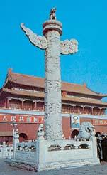 设在陵墓前的又名“墓表”。一般所见为石造。 柱身往往雕有蟠龙等纹饰,上为云板和蹲兽。 北京天安门前后的两对华表,用巨大的汉白玉雕刻而成,造型精美,是华表中的优秀作品。