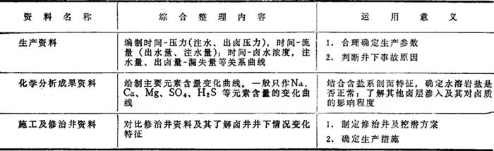 释义 | 单井动态分析 (一)资料收集 主要收集地质资料、盐井资料、施工作业资料及生产资料等,见表3-3-22。 表3-3-22 资料收集的主要内容 (二)资料整理及综合分析 主要根据生产资料、化学分析成果资料及施工、修治井资料进行整理和综合分析,判断井下情况。见表3-3-23。 表3-3-23 资料整理及综合分析表 |