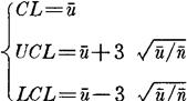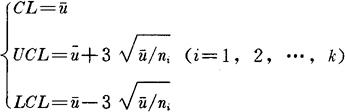 释义 | 单位缺陷数(u)控制图 简称u-图。它是用于判断或监控生产过程的单位产品缺陷数是否处于或保持标准所要求的水平。u-图主要用于质量指标为计点(如疵点、缺陷点、某细菌个数等)的场合。其作法是:抽取k个(k≥25)样本,要使每个样本平均至少有一个缺陷点。设第i个样本容量为ni,内含缺陷数为ci,则单位缺陷数及其均值的标准计算公式是: 则u-图的3条线的计算公式是: 显然,对于容量不同样本,两条控制界限都不同。 当 但,这种图在点子靠近控制界限时,要用标准计算公式重新计算控制界限,看点子是否真的不出界。 |