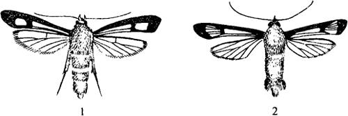 释义 | 单环透翅蛾 【学名】 Synanthedon unocingulata Bartel。 【分布与为害】 分布辽宁、河北。幼虫主要为害西府海棠、苹果等的枝干。 【形态特征】 雌蛾体长13~15毫米,翅展24~27毫米;雄蛾体长12~14毫米,翅展21~24毫米。体紫黑色,略带金属光泽。触角棍棒状,末端具微小毛束,触角背面灰黑色,腹面污黄色。头基部有1圈淡黄色鳞片。腹部第二节背面后缘有1个黄色鳞片的狭窄环带,第四节后缘背面有1个黄色鳞片的宽环带,第一、三、五腹节背面后缘黄色鳞片少。翅中央部分透明,边缘及翅脉黑色。前翅腹面在前缘及翅脉上杂有黄色鳞片,中室末端具黑纹,外缘有黑色缘毛。后翅杂有黄色鳞片,后缘有黑色缘毛。雌蛾腹末具黑色粗毛丛,其中央有2条纵走的黄色粗毛丛;雄蛾腹末黑色,粗毛丛扇形,边缘有黄粗毛(图9-62)。卵黄褐色,椭圆形,略扁平,表面有脊形成多角形网纹。老熟幼虫乳白色,体长26毫米。头宽2.4毫米,黄褐色,体表有稀疏刚毛。腹足4对。1~3对腹足趾钩19~22枚,第四对腹足趾钩12枚,臀足趾钩单序1列,趾钩5~8枚。蛹圆锥形,黄褐色,长10.8~15毫米。雌大于雄,第七腹节雌虫具1列横棘;雄具2列横棘,末端有8~10个大小不等臀棘,每个臀棘尖端具刚毛。 图9-62 单环透翅蛾 1.雌成虫 2.雄成虫 【生活习性】 在天津1年1代。以幼虫在树皮下结薄茧越冬。次年5月中旬化蛹,5月下旬开始羽化。6月上旬开始产卵,6月中旬孵化。幼虫期约1个月。成虫羽化后不久可交尾、产卵。卵散产于树皮上。每雌可产卵203~290粒。雄蛾寿命1~3天,雌蛾3~6天,卵期7~10天。幼虫孵化后在附近啃食树皮,以后钻入韧皮部,8月可见排出的红褐色颗粒状物,9月底在树皮下隧道内褐色液中取食。11月下旬在隧道中结薄茧越冬。隧道长5厘米。翌年3月幼虫出茧外取食,5月初可见树干上排出的红褐色粪便,5月中旬幼虫在树皮内咬一圆形羽化孔,孔口有1层薄树皮,在内吐丝作茧化蛹。蛹前期4~7天,蛹期8~11天。 【防治方法】 春、秋、冬用小刀戳杀有红褐色粪便的树皮下的幼虫。幼虫孵化盛末期(约8月上旬)幼虫蛀入皮下较浅时,喷50%辛硫磷500倍液,或25%园科3号200~300倍液,或涂抹树皮蛀孔处亦可。 |