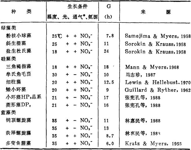 释义 | 单细胞藻类生物量及生长测定 批量培养中的单细胞藻类生长呈如下模式(图40—1)。 图40—1 批量培养中单细胞藻类生长模式 1.延迟期 2.指数生长期 3.稳定期 4.衰亡期 一、生物量的测定 1.细胞计数法 通过计样品中的细胞数,以推算实际生物量,有多种方法。这里只介绍常用的显微镜直接计数法。该法需用显微镜,镜台测微尺和计数框。计数前一般将藻细胞(特别是鞭毛类)以碘液固定(KI,10g溶于20ml水中,用量不大于1%)。计数框要清洁干燥;其面积为2×2cm2(4×108μm2),容积为0.1ml。用视野计数法首先换算出计数框面积相当于所用目镜视野面积的倍数,例如10(目)×40(物)倍,测得视野直径相当于镜台测微尺的21.5格,已知每格为10μm,故该视野直径为215μm,计算得其面积为: 3.1416×215/2μm2=36305.1μm2 进而求出计数框相当于视野的倍数为: 4×108μm2/36305.1μm2=11017.70 计数每个视野的细胞数,乘以11017.70即为0.1ml样品中的细胞总数,再乘以10,得细胞数/ml。视野计数时需注意移动计数框,约测10个视野,取平均数,以减少误差。上述专用浮游植物计数框,可以从水生生物研究所工厂玻璃车间购得,使用较为方便。 2.整细胞光密度法 用光电比色计或分光光度计测定,以OD表示培养藻液的相对浓度。 根据藻类的种类不同,选用不同的滤光片或波长。一般测定硅藻、绿藻和蓝藻时,选用的波长分别为OD420nm、OD540nm和OD620nm。测定时,以较浓培养物的稀释倍数对log2OD作坐标,应呈直线关系。同时,将不同稀释倍数的已知光密度的培养物的滤出物分别烘干至恒重,所得干重数与OD读数亦应有一个换算分数,如,泉生偏缝硅藻干重(g/L)=0.069×OD420nm。从而只简便地测光密度数,就可得到实际生物量(干重)。 3.叶绿素测定 所有藻类都含有叶绿素a,同一种类,在相对稳定的生长条件下.其细胞中的叶绿素a含量也是相对稳定的,从而,测定培养物的叶绿素a含量亦可求出相对生物量。具体方法,见本第三章第一节。 无论是用上述哪种方法测定,均必须严格注意取样的均匀性、随机性和适宜的测定范围,并最好有多样品重复。 二、生长计算 单细胞藻类的生长是指单位时间内细胞数的增加。此中,细胞数,包括其固有的特征如叶绿素、蛋白质、核酸等的含量都以同样的速度增加。这种增加与起始量和时间的关系可以下式表示: K=dN/N0dt 式中:N0和N是单位培养基中测定指标(细胞数、光密度数、叶绿素含量等)在培养测定时间(t)之始、末的读数,K是比生长速度。 转化为10为底的对数,则: 此中,K′=K/2.3。 当N=2N0,即测定指标刚好加倍时,得 亦即,细胞加倍时间 t=0.301/K′=0.693/K 指数生长期中细胞加倍时间(t)习惯上用G(世代时间Generation time)表示。下表列述了在给定条件下,几种常见藻类的生长速度(G)。 表40—7 几种常见藻类的生长速度示例 * 空气±1—5%CO2。 (编者:张宪孔 审者:陈明耀) |
