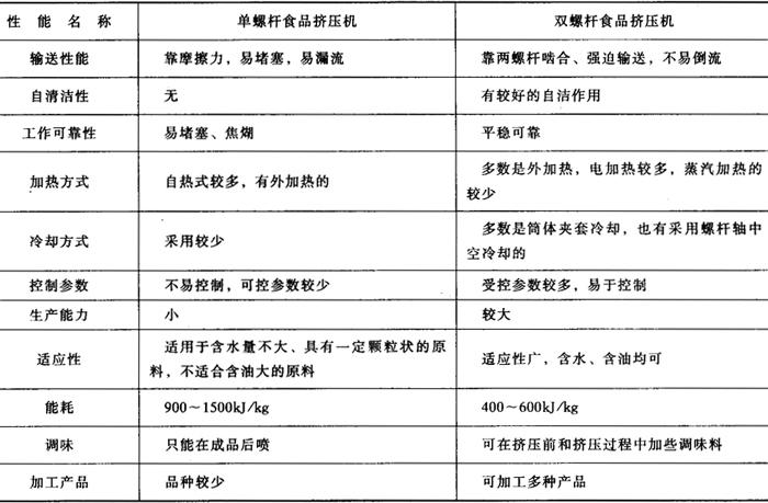 释义 | 单螺杆与双螺杆挤压机的性能比较 单螺杆食品挤压机与双螺杆食品挤压机在性能上有比较大的差异,为了对比清楚,把它们的各自性能列于表3-6-1。 表3-6-1 单螺杆与双螺杆食品挤压机性能比较 |