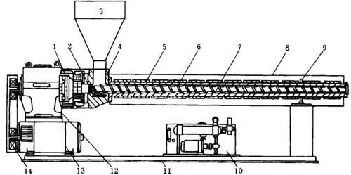 1-止推轴承 2-密封装置 3-料斗 4-进料口 5-冷却水与加热器 6-料筒 7-螺杆 8-料筒隔热防护罩 9-料筒支座 10-封闭冷却系统 11-地基 12-减速器 13-电机 14-皮带和皮带轮