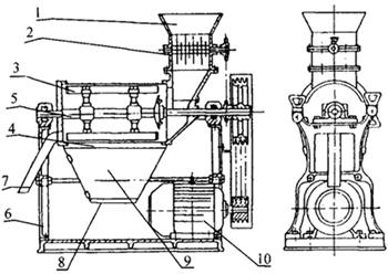 1-喂料斗 2-破碎盘 3-打击板 4-圆筒筛 5-转动轴 6-机架 7-排渣口 8-出浆口 9-贮浆槽 10-电动机