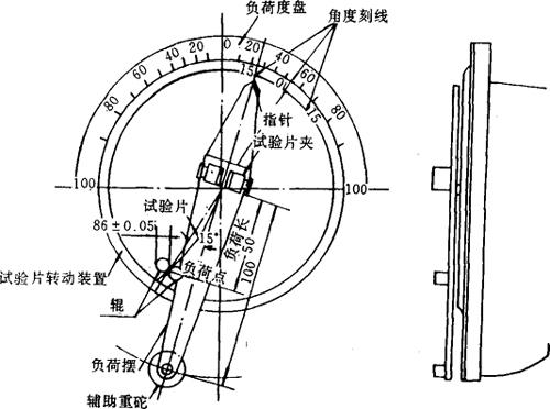 图8-2-19 挺度测定仪构造示意图 (1)摆的力臂长100mm±0.1mm。 (2)试样的负荷力臂长50mm±0.1mm。 (3)刻有0~100分度的负荷度盘。 (4)标有15°±0.1°和7.5°±0.1°角度刻线的角度盘。角度盘的转动速度为每分钟200°±20°。 (5)具有调距结构的小辊,直径为8.60mm±0.05mm。 (6)测定范围: 0~50g·cm 0~1000g·cm 0~100g·cm 0~2000g·cm 0~200g·cm 0~5000g·cm 0~500g·cm (7)仪器的刻度精度在±2%以内。 4.方法 (1)切取宽38.0mm±0.1mm,长70mm±1mm的试样,纵、横向各不少于5条。 (2)将试样的一端垂直地夹于固定夹上,试样的另一端插于仪器下面的两小辊之间,然后用固定螺丝把试样固定。注意要使试样与摆的中心刻线重合。用小辊调距装置把试样和两小辊之间的距离之和调成0.33mm±0.03mm。 (3)按试样的不同挺度,通过更换重砣选择测定范围,使得试样在负荷度盘上所测定的读数在20~70刻度之间,打开开关,弯曲试样至摆的中心线与角度盘上的15°刻线重合时(如试样挺度过大或弯曲至15°时断裂,可弯曲至7.5°,测定结果乘2可得出一个近似值,但要在报告中注明),立即关闭开关,记下摆的中心线所指的负荷度盘读数,精确至半个分度。上述操作分别向左右方向进行,即分别测定试样向正面弯曲和向反面弯曲15°时的读数。 采用0~50g·cm、0~100g·cm、0~200g·cm、0~500g·cm、0~1000g·cm、0~2000g·cm、0~5000g·cm的测定范围时,其换算系数R分别为0.5、1、2、5、10、20、50。 5.单面白纸板的挺度S(g·cm),按下式计算: S=G×R 式中 G——向正、反面弯曲试样至15°时的读数平均值; R——所用测定范围的换算系数。 计算结果修约至3位有效数字。 每一包装单位中,从取出的不同试样上切取纵、横向各5条进行测定,以纵横向所有测定值的平均值报告测定结果,并报告最大值、最小值。 |